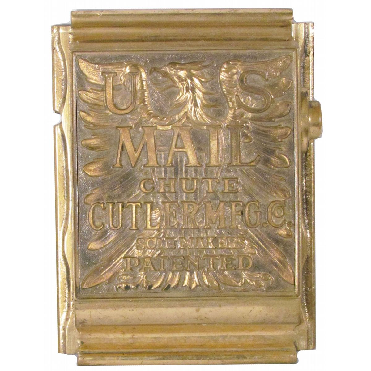 Brass Mail Chute Cover. Patent date 1903 by the Cutler Mfg. Co. Sole Makers. Heavily embossed brass. Excellent condition. 6 X 8 1/4 X 2 1/4 inches.