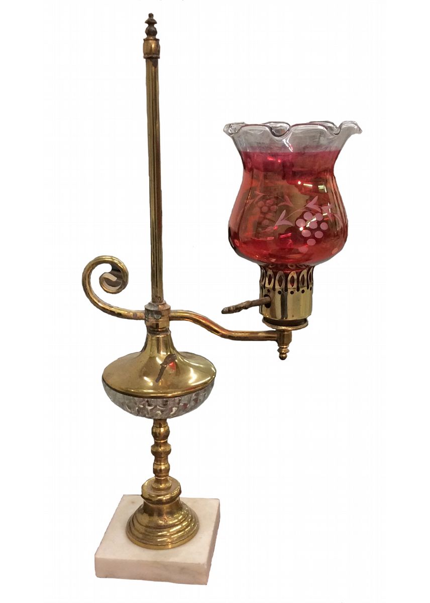 1950’s – 1960’s Brass & Marble based lamp, with etched ruby glass chimney it was converted to electricity.