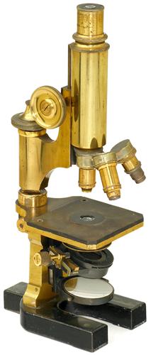 Messing-Mikroskop, um 1900 Unbezeichnet, vermutlich Zeiss, Höhe: 32 cm, 3-facher Objektivrevolver, 2 Objektivdosen, Feineinstellung, mit Namensschild "Dr. Robert Muencke, Berlin", Halter für Irislinse etwas verbogen. Original-Holzkasten.
