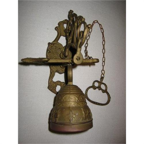 This 9 inch Brass Bell is highly ornate with figures of people positioned in different style. It is engraved and is very decorative. It has space for wall hanging with a beautiful chain attached to a nice loop or handle. Most likely an old door bell. The bell itself is 2.5 inch in diameter. The chain is 14 inch tall including the loop or handle. Overall height of the Bell is 17.5 inch and is in excellent condition. This bell is lovely!
