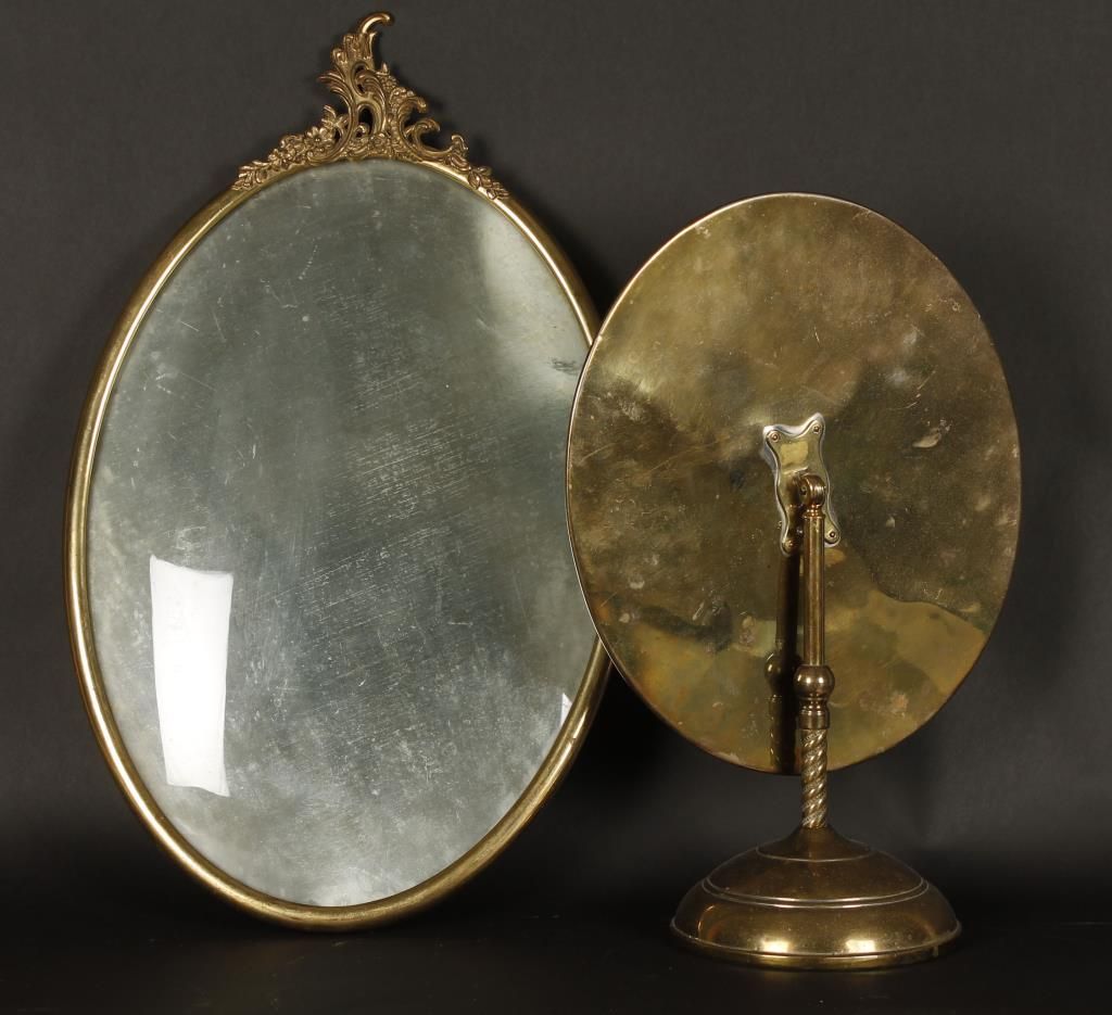 Picture frame has bubble glass. Circa 1920's. 14" wide x 23" tall. Shaving mirror is on stand. Circa 1870's. 12" wide x 18" high.