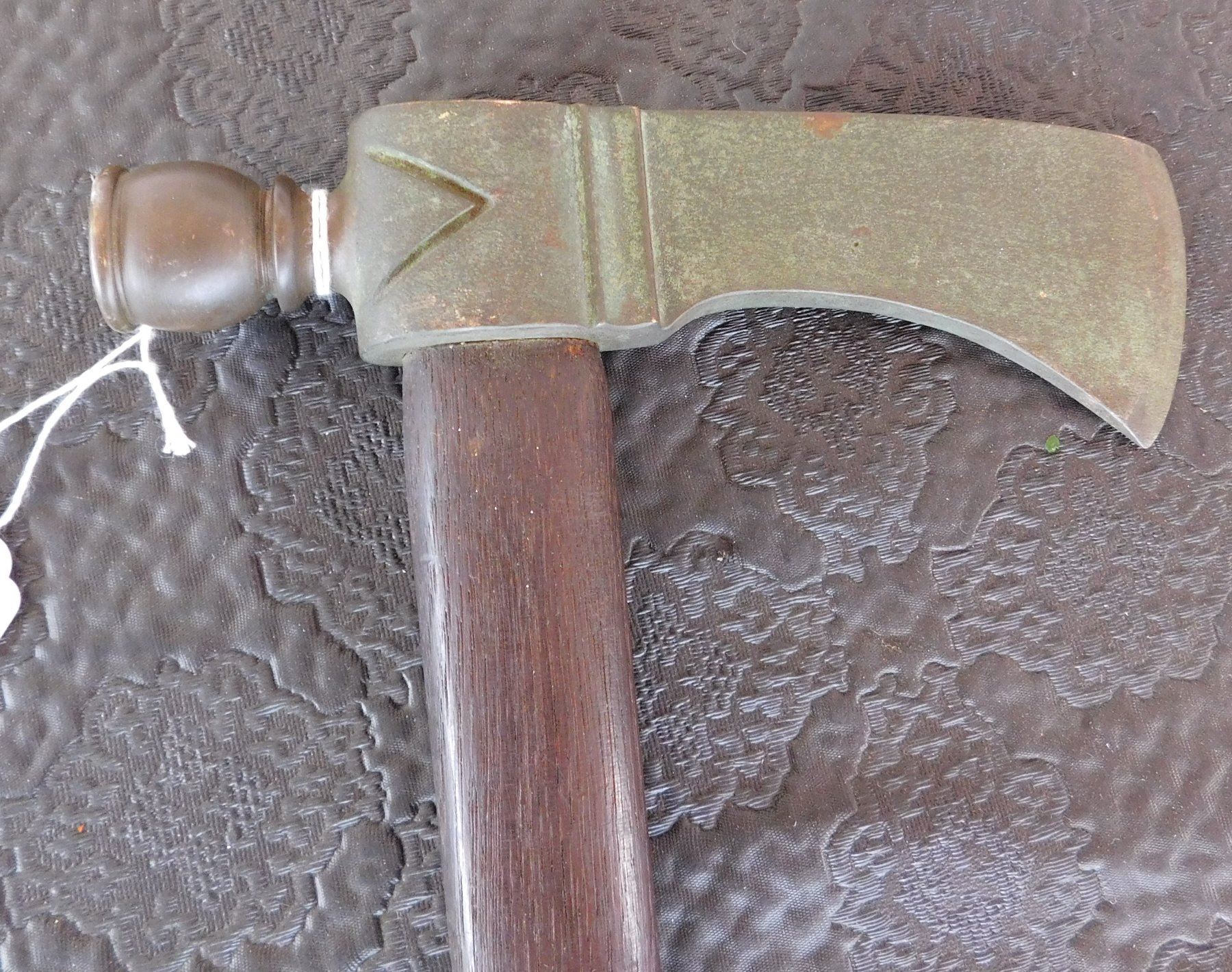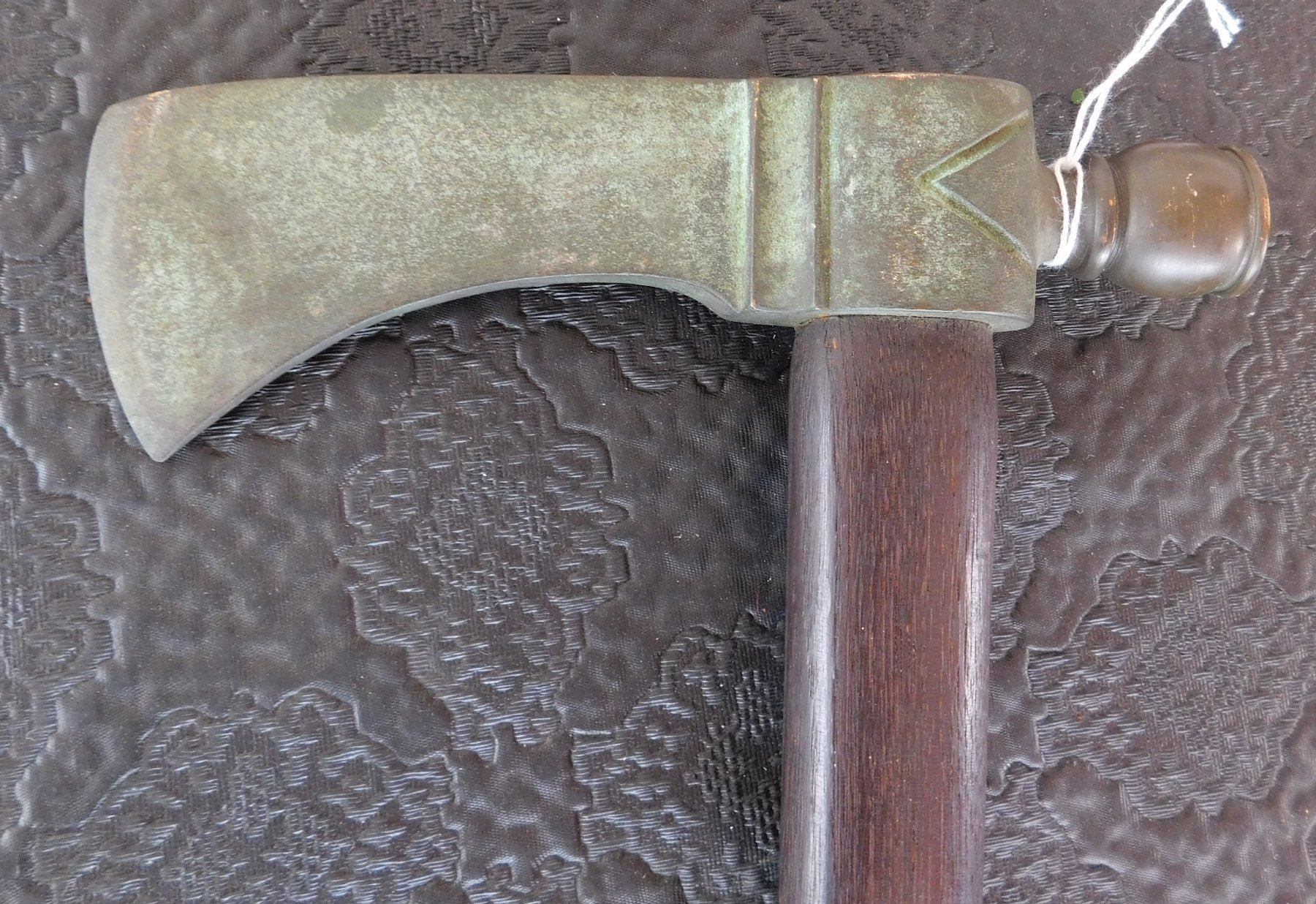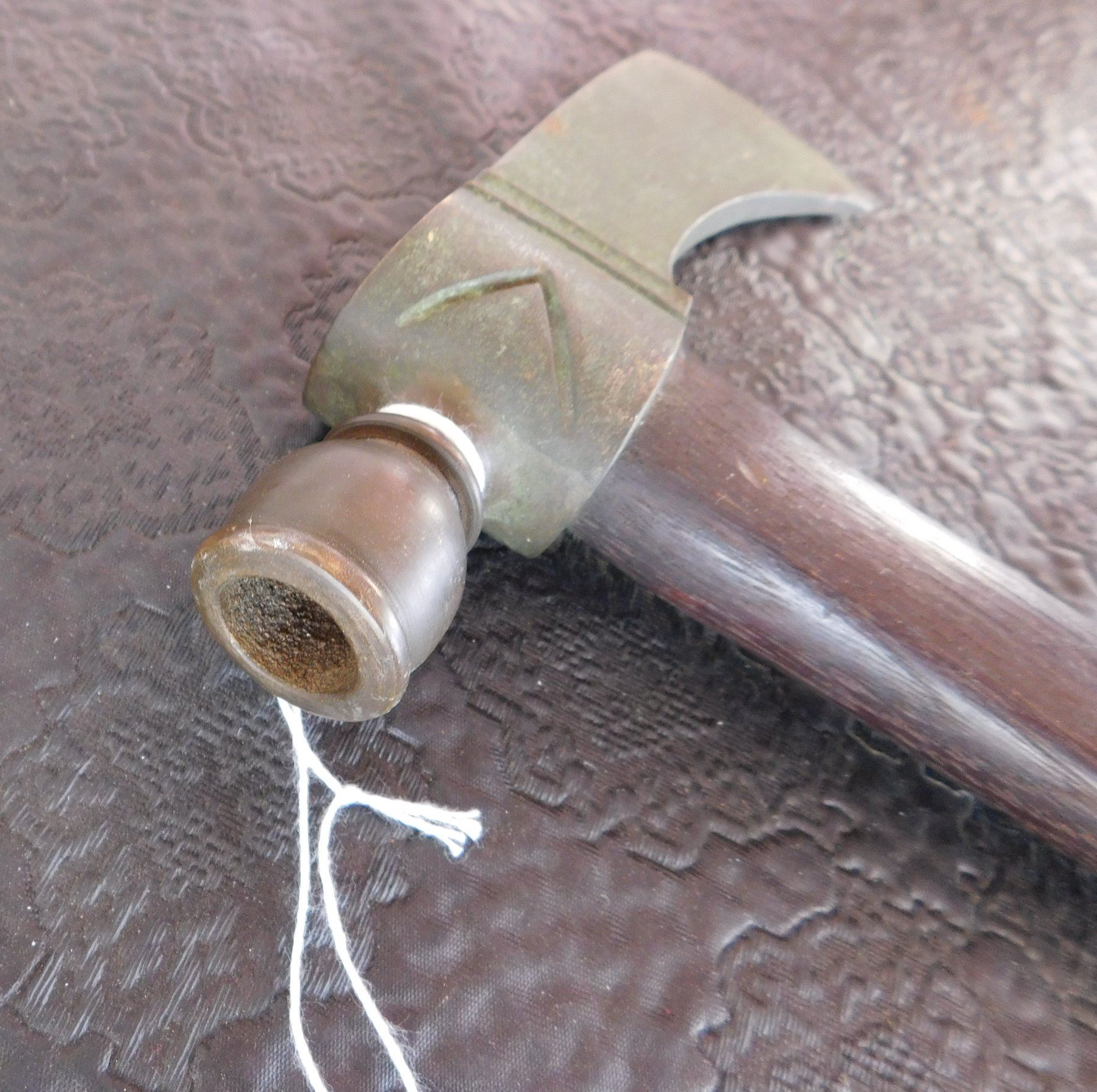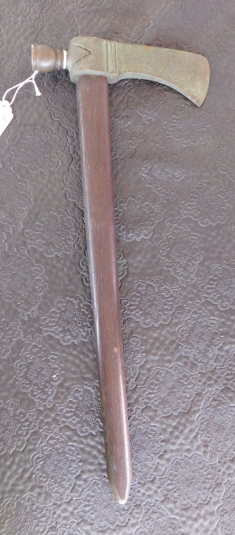 Brass Pipe Tomahawk, c. 1900. Made of wood and brass, the item measures 17" x 7.5" x 1.25". English-made. Heavy head. Condition: Good, heavy patina, see images. Shipping: $26.50 w/insurance and signature due to length.
