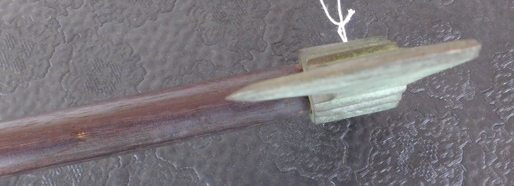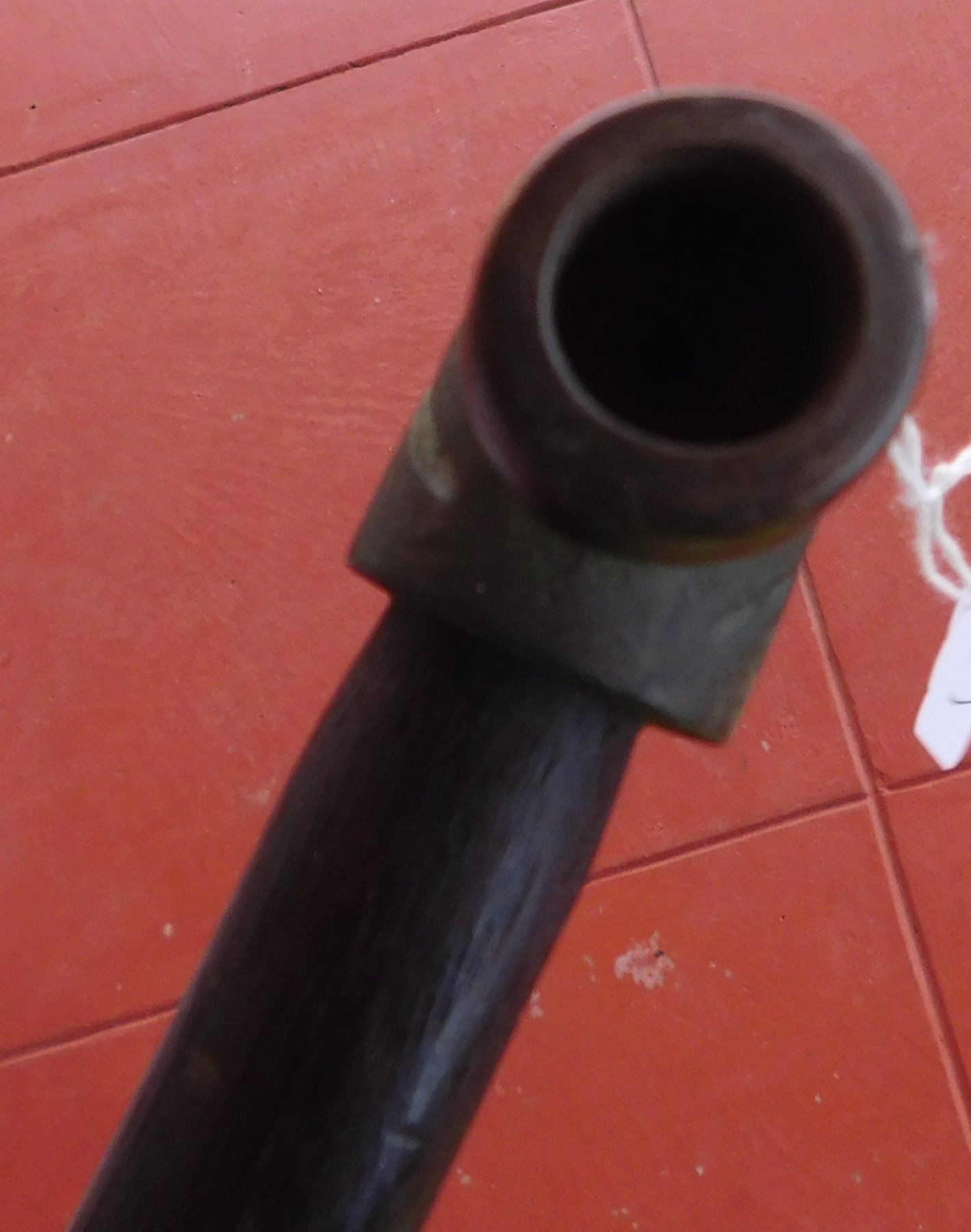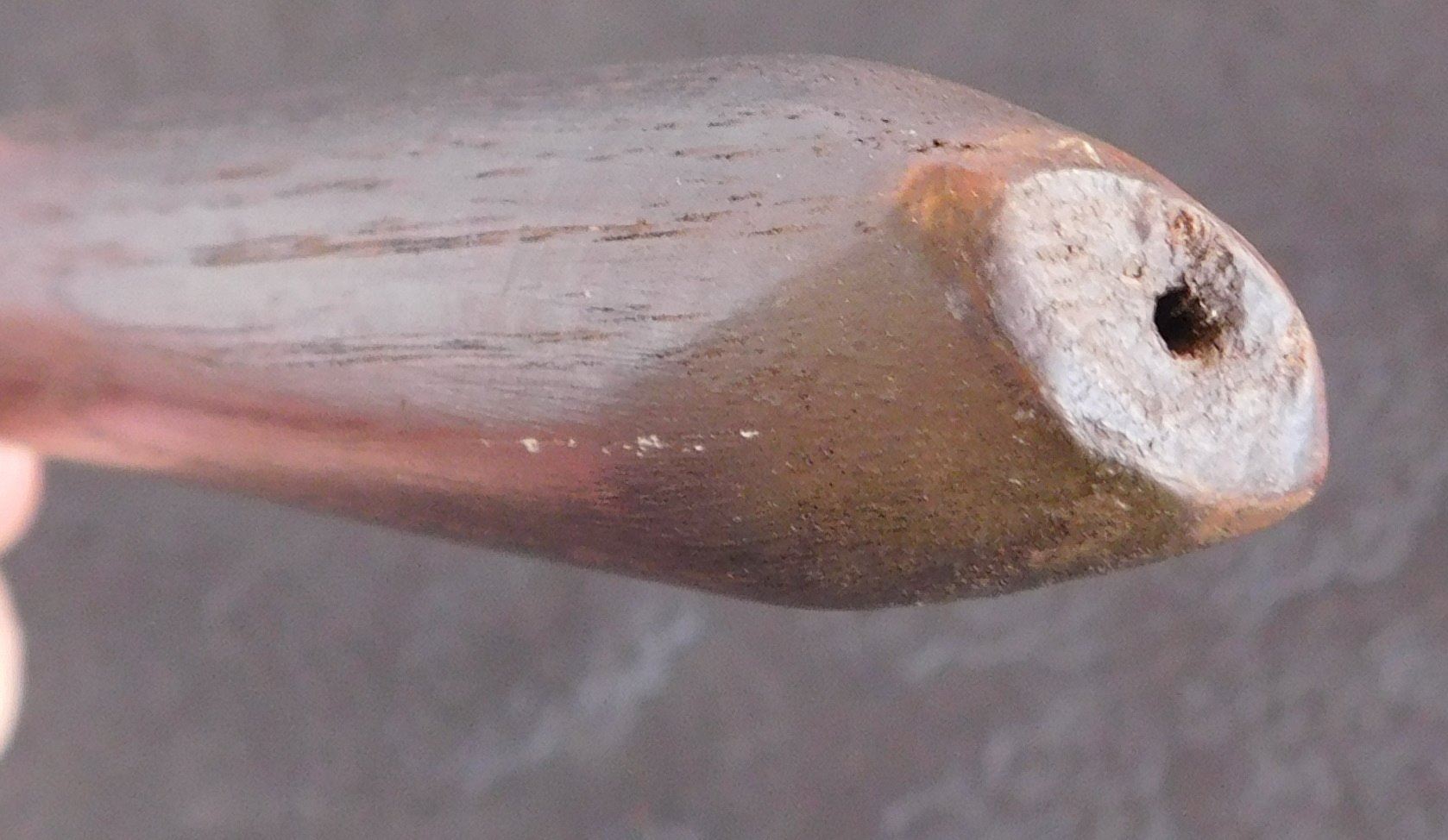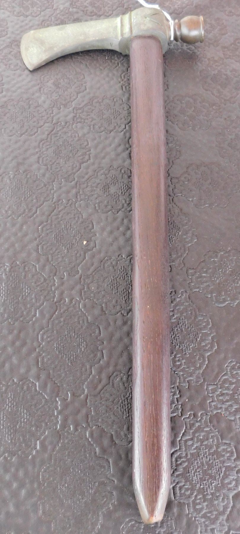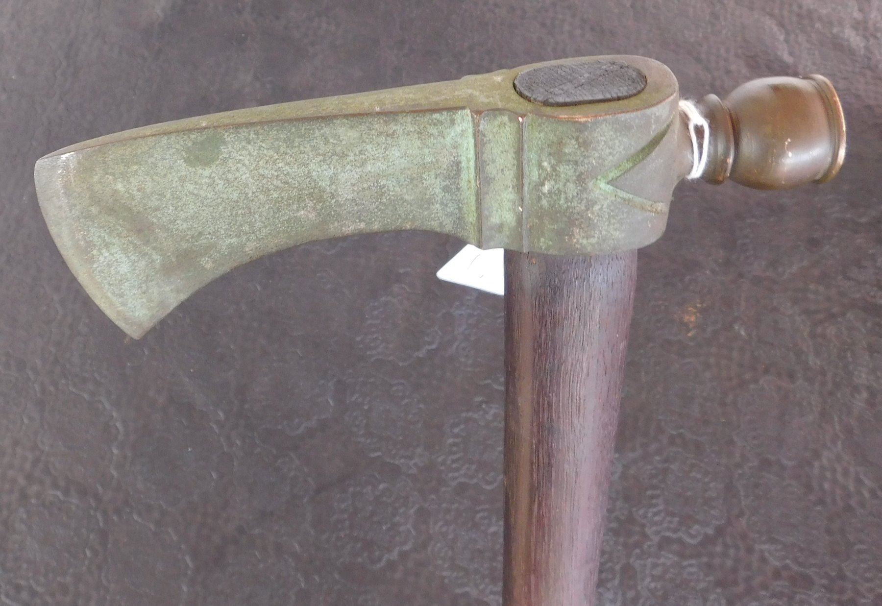 Brass Pipe Tomahawk, c. 1900. Made of wood and brass, the item measures 17" x 7.5" x 1.25". English-made. Heavy head. Condition: Good, heavy patina, see images. Shipping: $26.50 w/insurance and signature due to length.