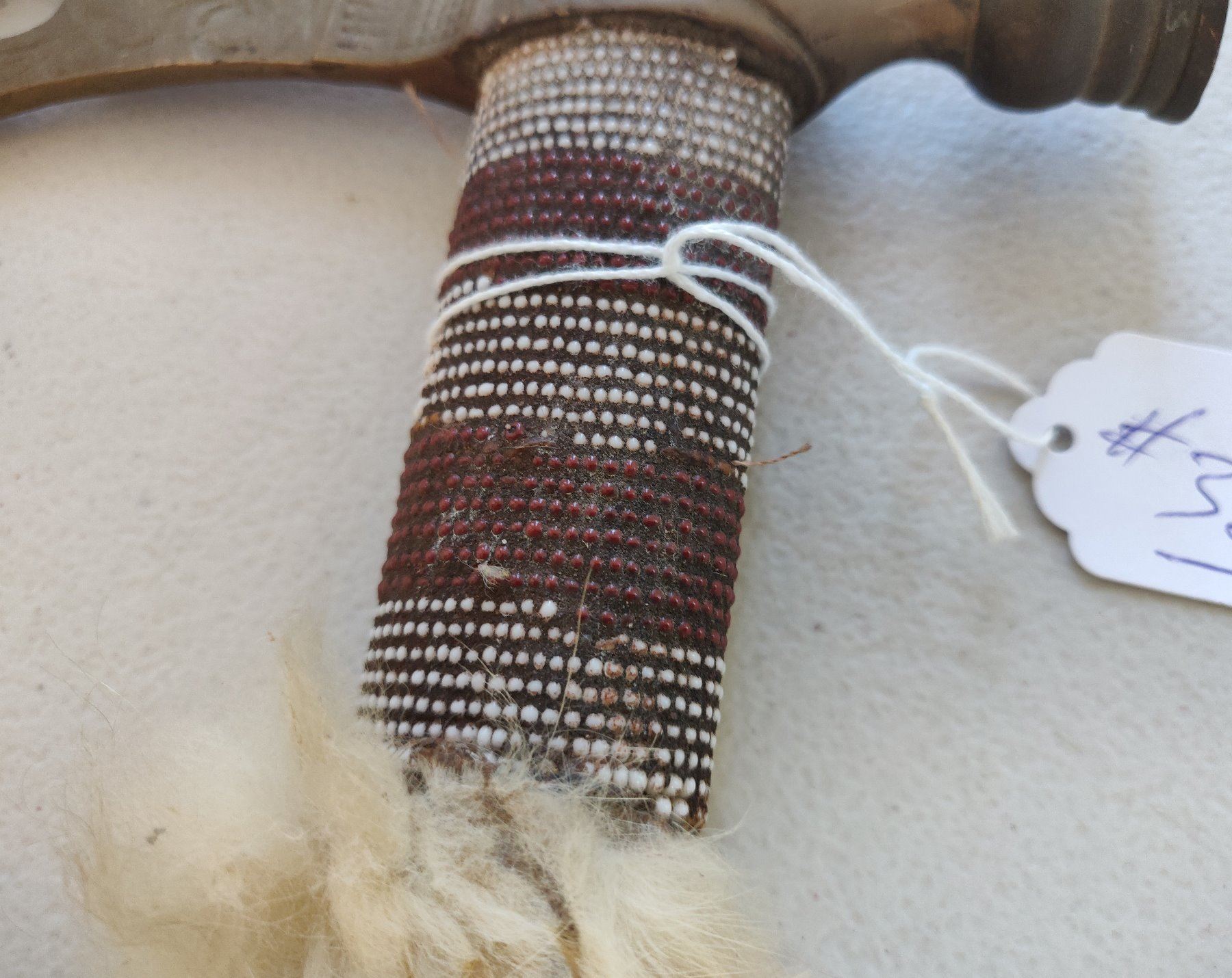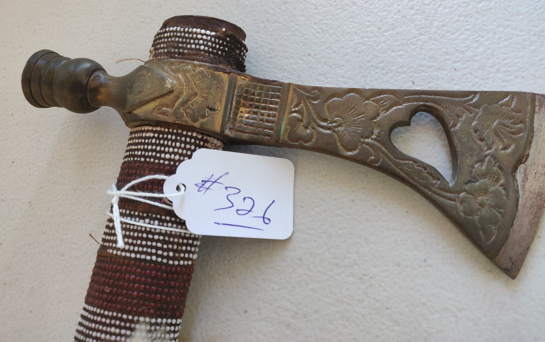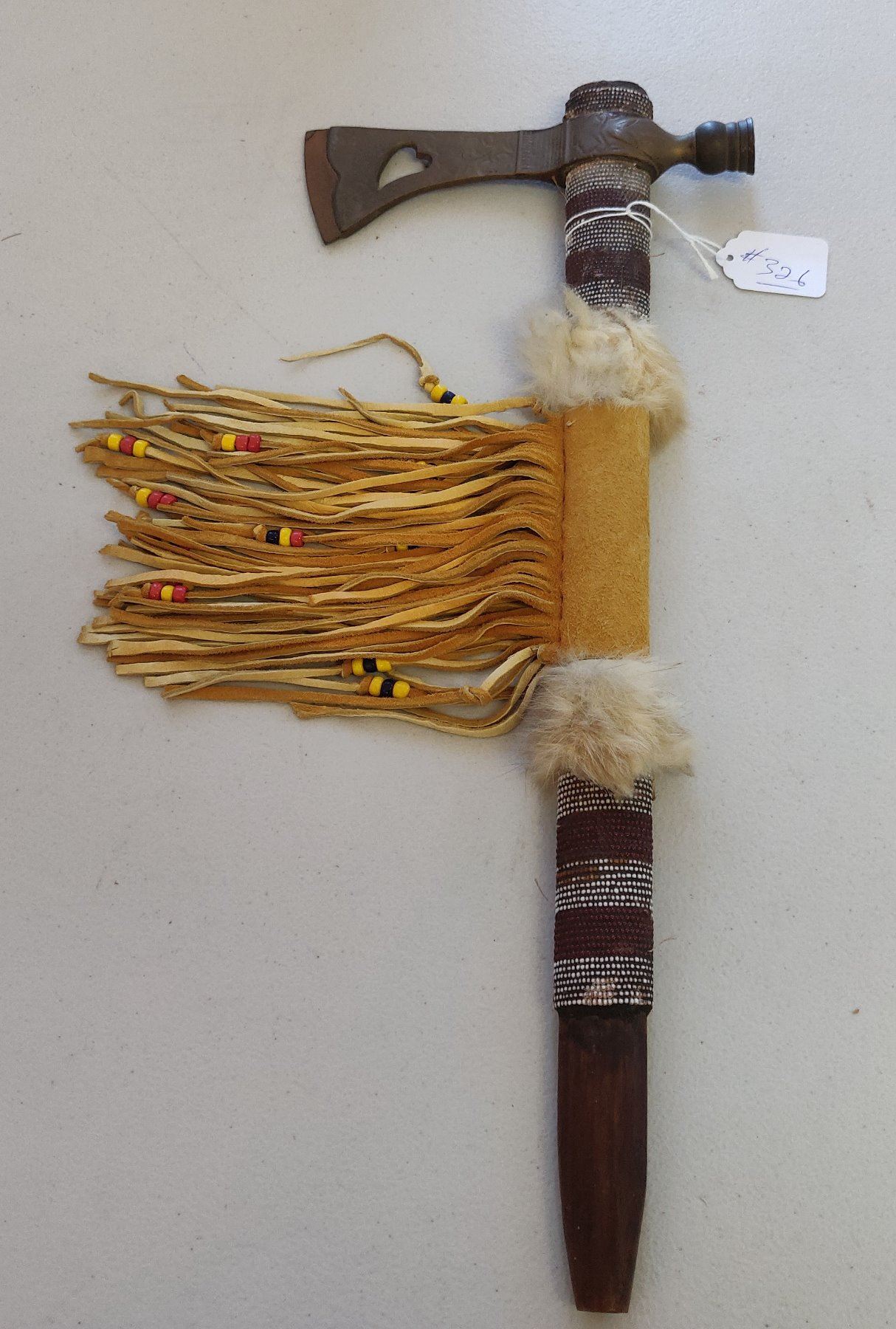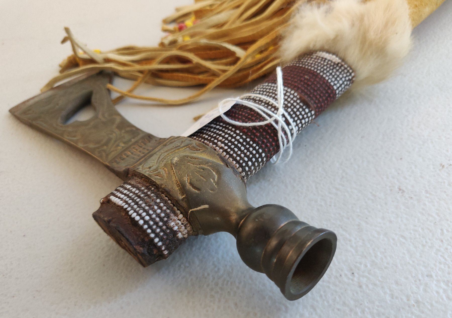 Brass Pipe Tomahawk, 20th century item. Made of leather, wood, brass, steel and glass, the item measures 17" x 7 1/2". South Dakota. Nice smoker, steel bit sweated into brass. Condition: Patina, see images. Shipping: $25.50 w/insurance and signature, due to size, weight and value.