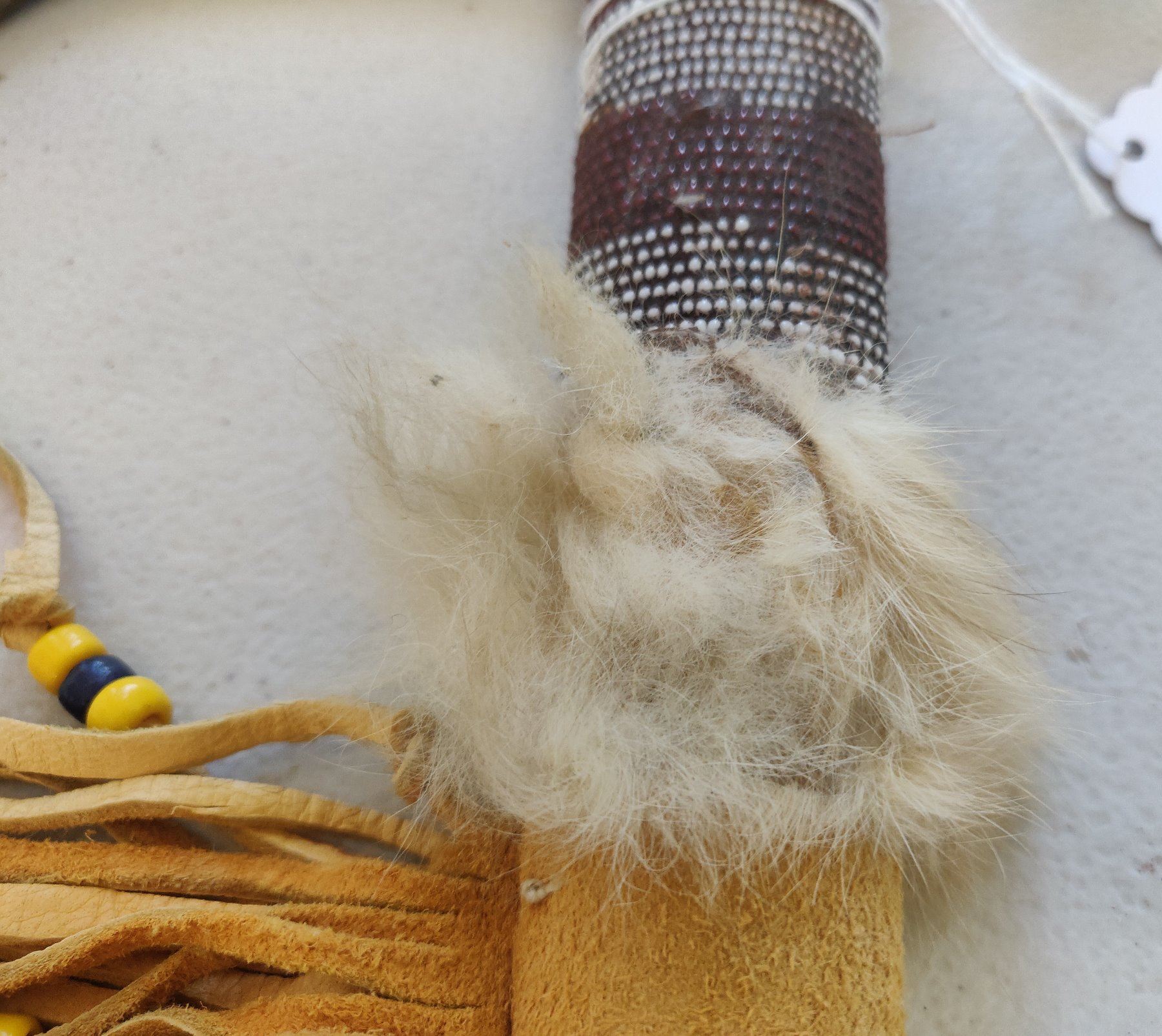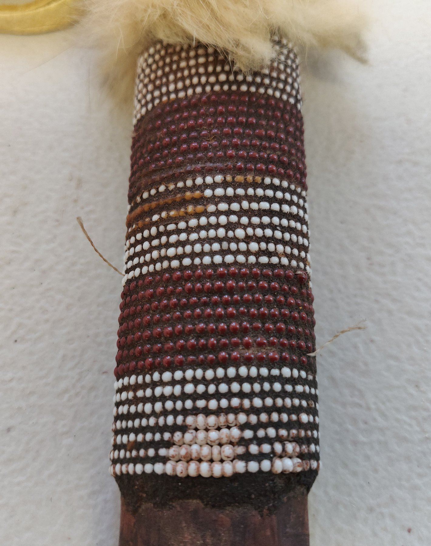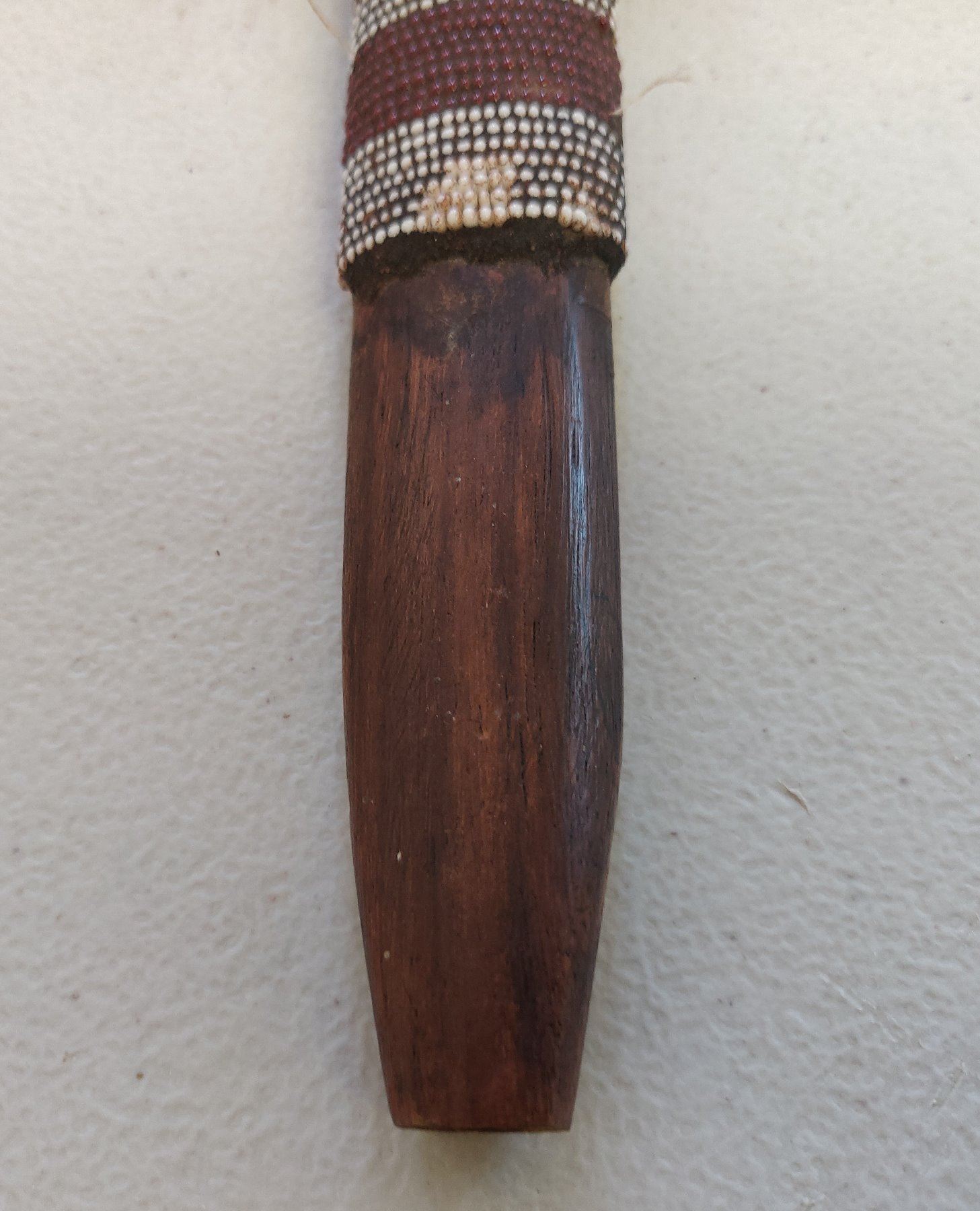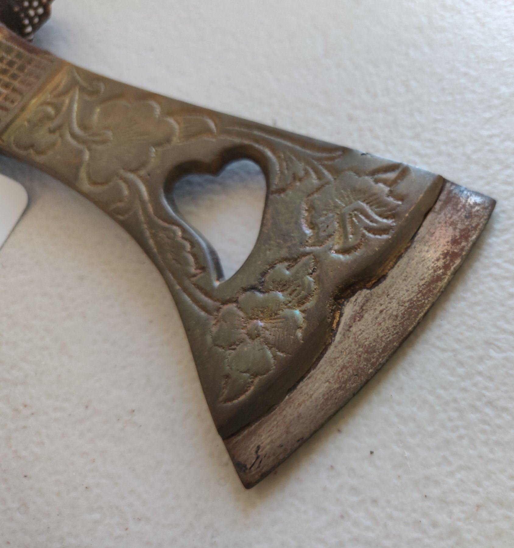 Brass Pipe Tomahawk, 20th century item. Made of leather, wood, brass, steel and glass, the item measures 17" x 7 1/2". South Dakota. Nice smoker, steel bit sweated into brass. Condition: Patina, see images. Shipping: $25.50 w/insurance and signature, due to size, weight and value.