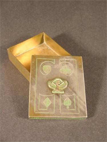 Brass playing card case with silver plate lid. Egyptian motif on lid. Holds single deck. Ex. cond.