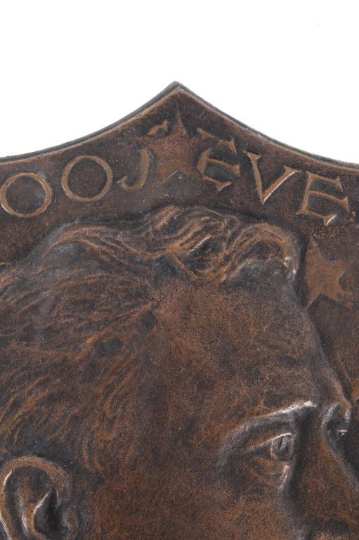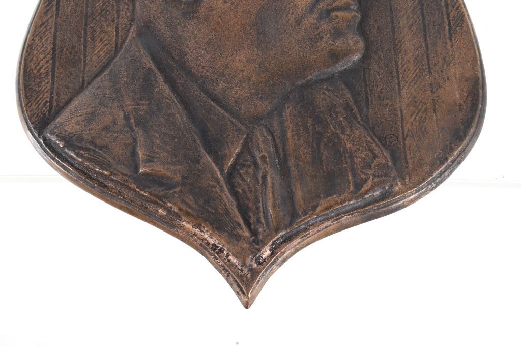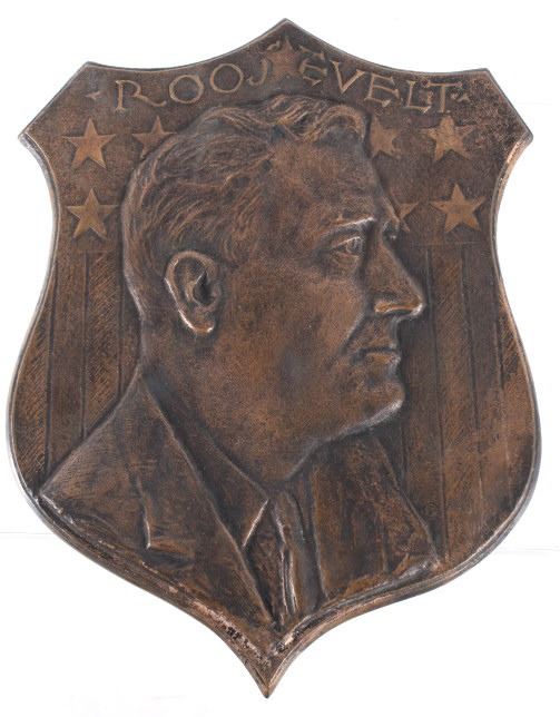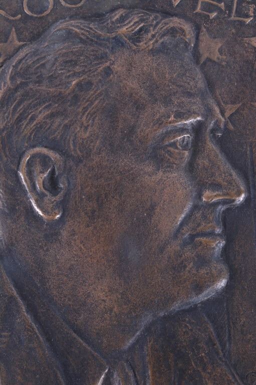 Offered in this lot is a brass wall hanging, portrait, shield of F.D. Roosevelt, the 32nd U.S. president. On the back is “Copyrighted 1934 Zandt Brass Foundry Co. Seattle, Wash Serial No.” On the front lower right corner is the artist’s name. The shield measures 11" X 8 1/2" X 1/2".