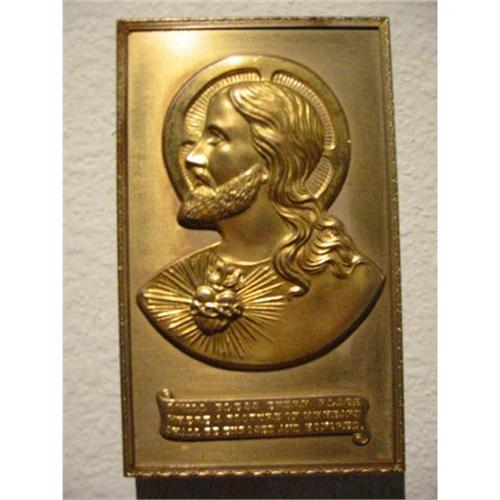 magnificent religious icon ormolu with beautiful carvings decorated with frame and has a silk fabric backing on the stand or its stand. description reads: I WILL BLESS EVERY PLACE WHERE EA PICTURE OF MY HEART SHALL BE EXPOSED AND HONORED. this icon is made of a brass golden shiny color w vintage imperfection. overall in excellent condition. 7.5"Tx4.5"w. decorative, collectible and fantastic.