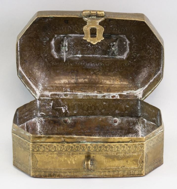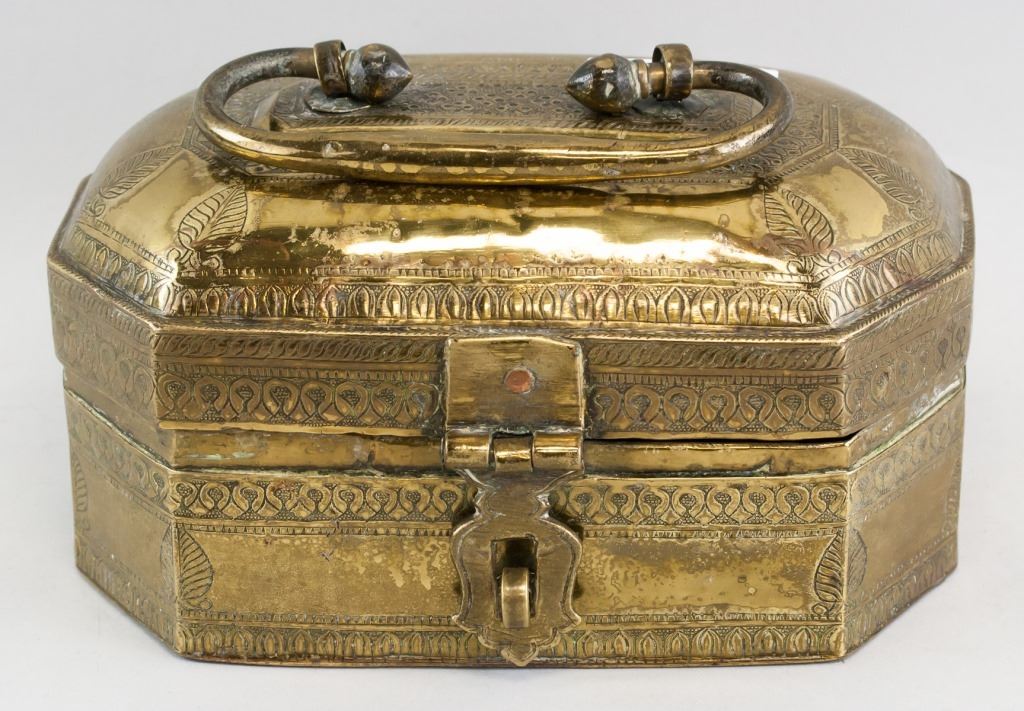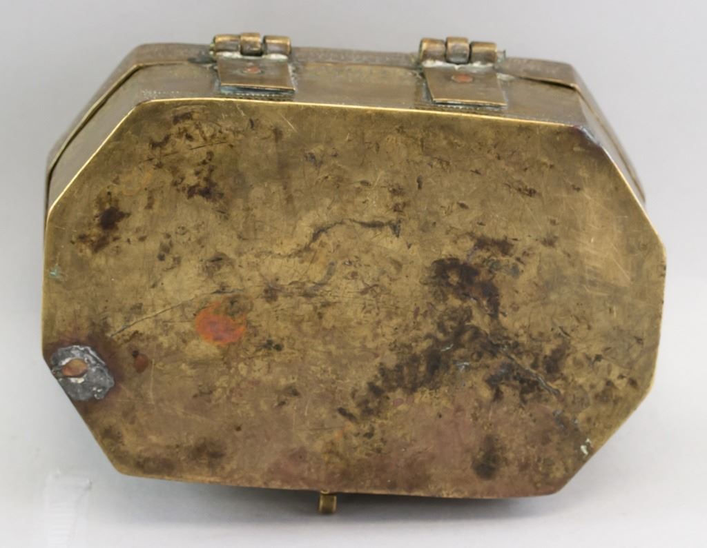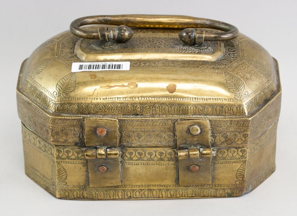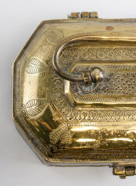 Brass storage box. Of burnished gold tone. With carvings. 12 x 20 cm, 1434 grams.