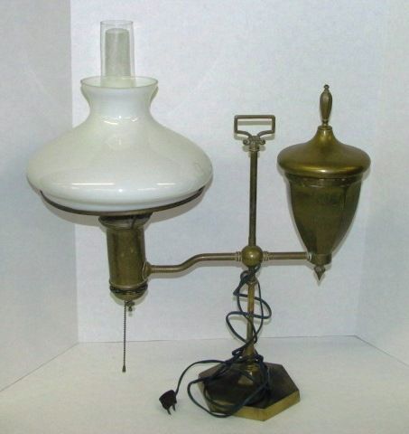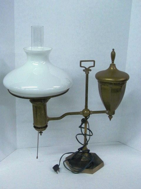 1930-40's Adjustable Height Brass Student Lamp, with shade and chimney