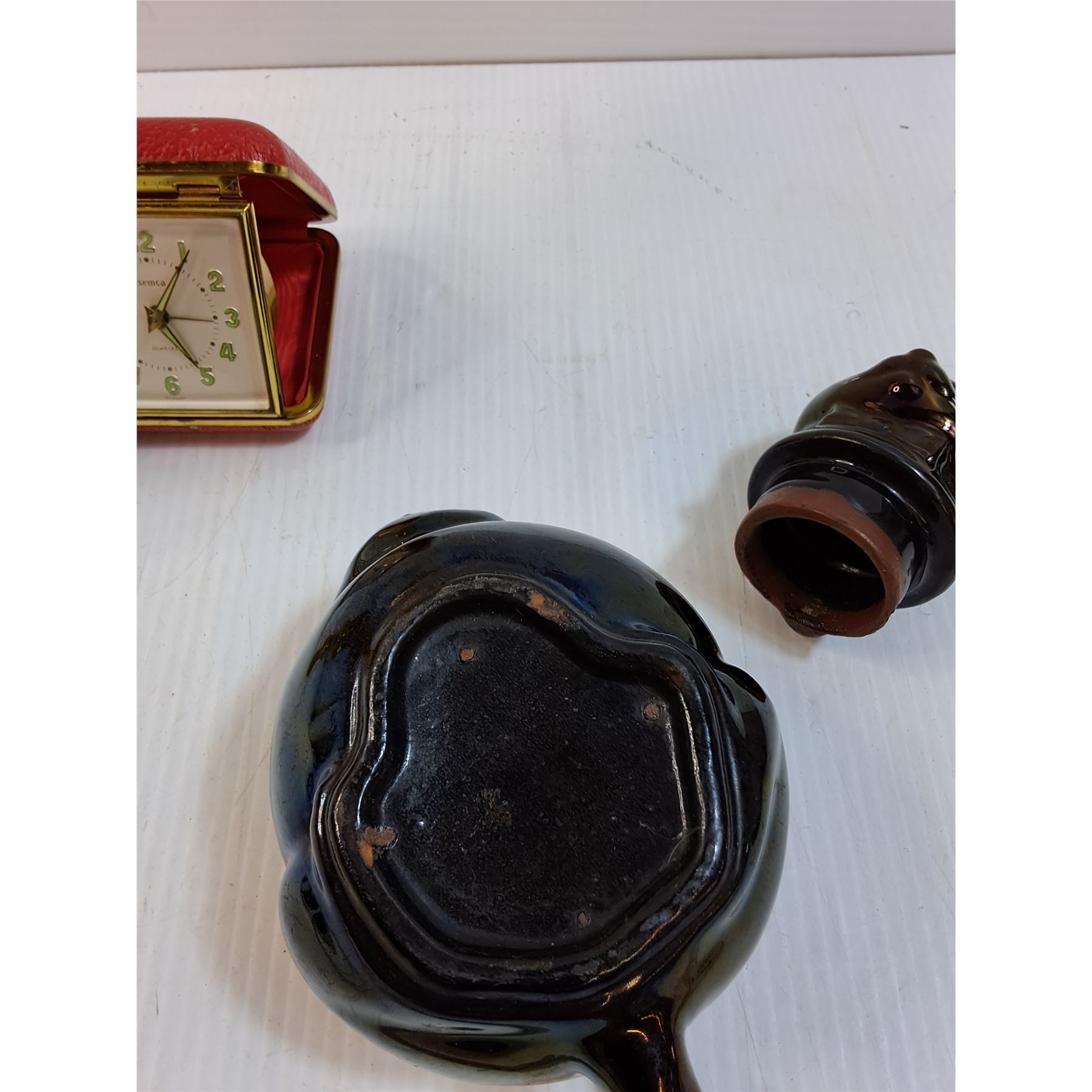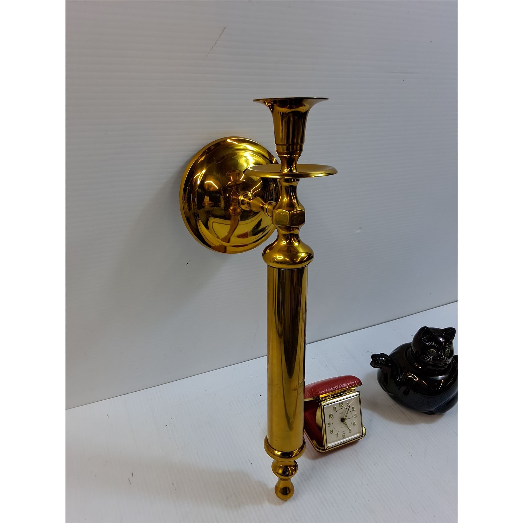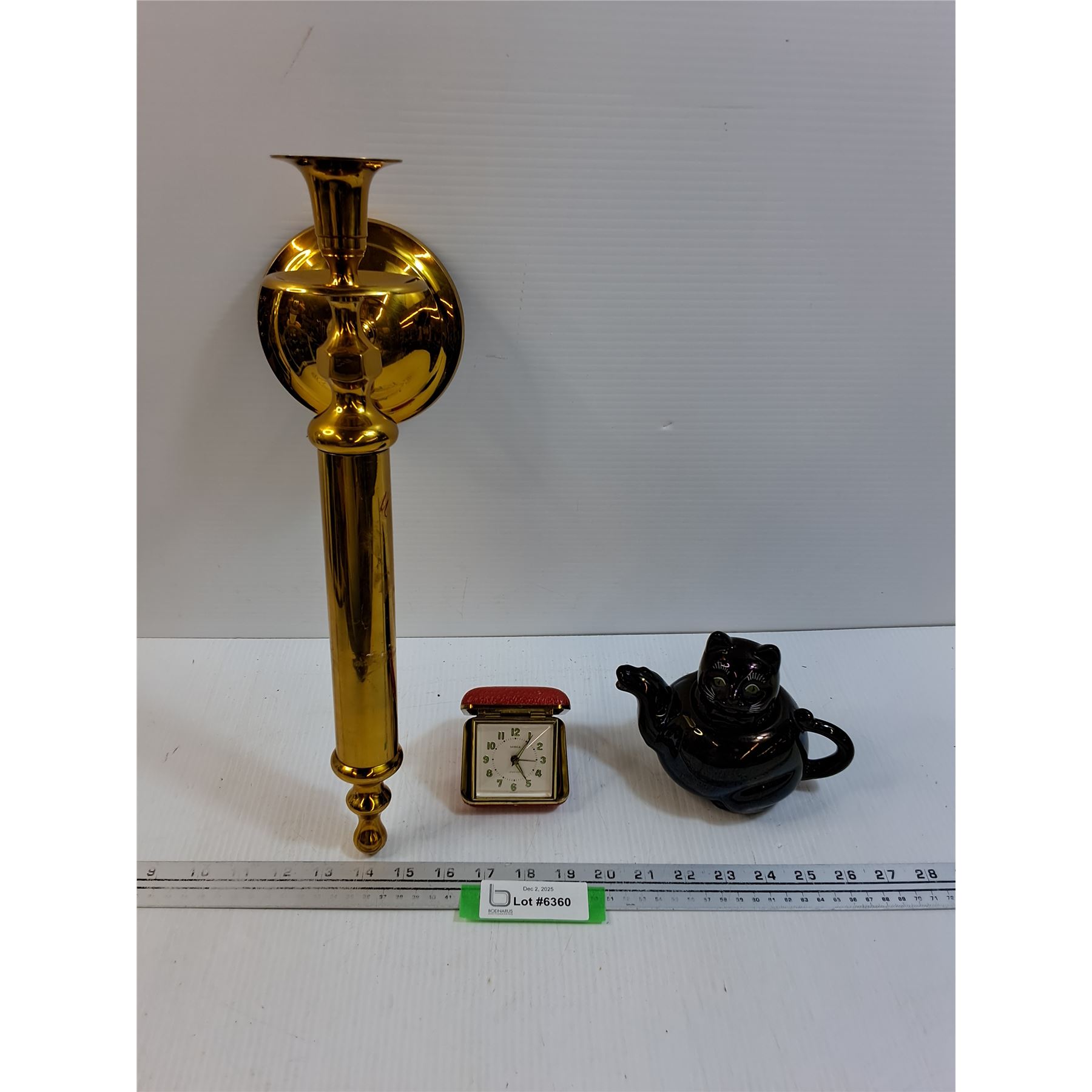 Brass Style Candle Wall Mount Holder, Black Iridescent Mini Teapot, Vintage End Table Clock - As Is