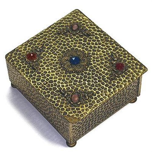 This ornate hammered brass, with Teak wood insert, jewelry box was produced circa 1940. The lid features five intricately designed medallions each set with pink, red, and deep blue color glass jewels. Stands on four brass feet, measuring 3 3/4 inches x 3 1/2 inches across x 1 3/4 inches tall and, except for a little wear, due to age, is in excellent condition without any damage to the box, glass jewels or wood.