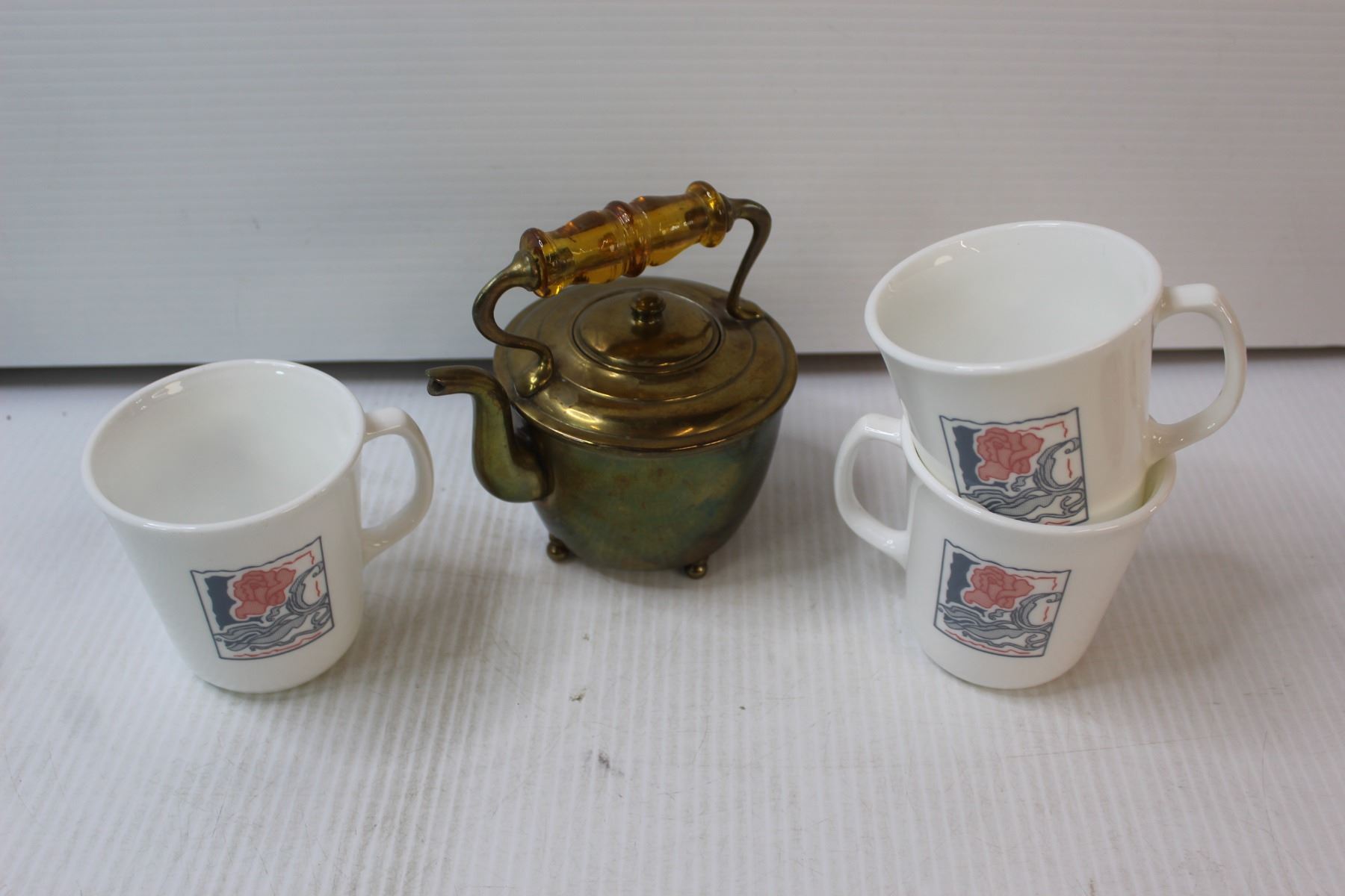 Brass Teapot, (3) Mugs, Decanter, (2) Shot Glasses, Small Plates, Chalkware, Glass Display Case, etc.