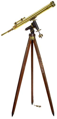 Brass Telescope "Wray, London", c. 1900 Parallactic mounting, polished brass, length 55 in., on heavy-weight tripod, height 74 in.<Br>
