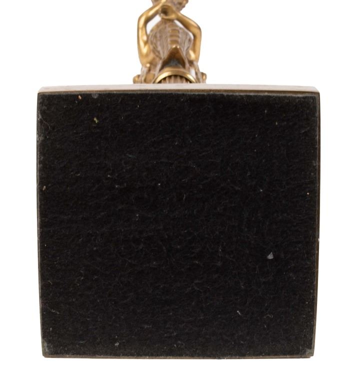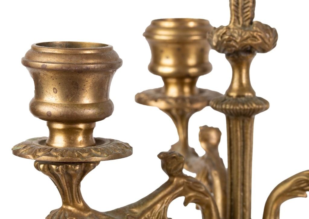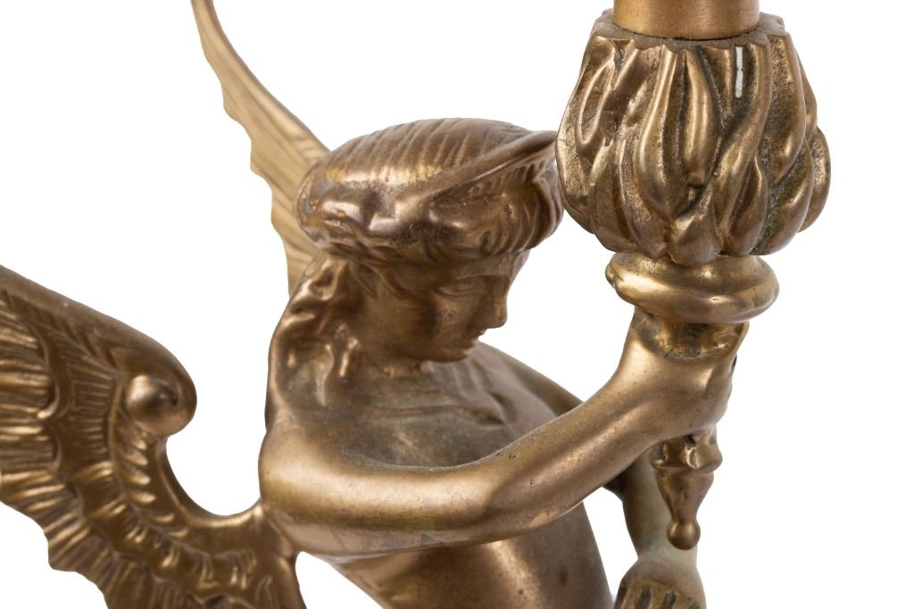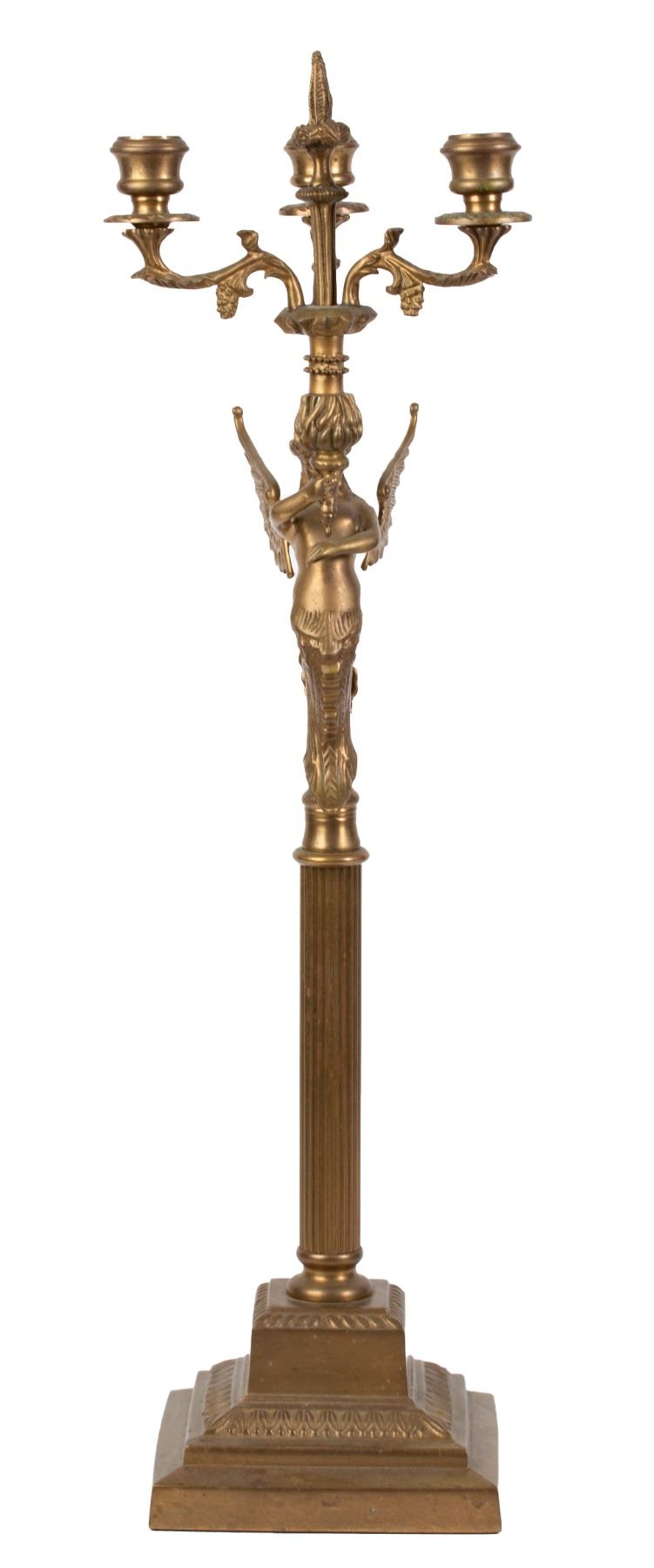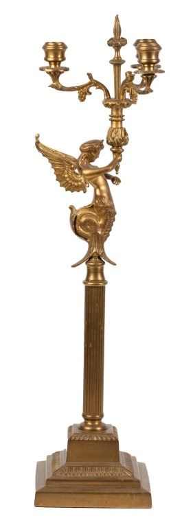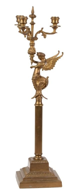 Item/Description: Table candelabra features winged sea nymph. Holds three candles. Column design. (Mythological, Mermaid, Candlestick. Antiqued Candle Holder)