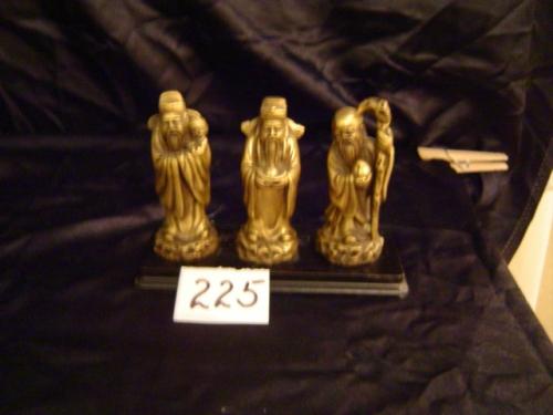 Solid Brass Three God Set secured to Black Base. Each figure is just under 4" tall, base is 6.5" X 2.5". Chinese Gods of Prosperity, Wisdom and Longevity. Feng Shui Piece in excellent condition. From China.