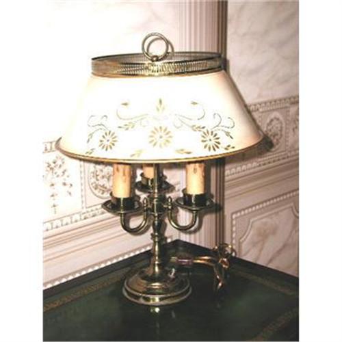 Traditional style brass and cream C.1930 lamp has gold tole design on the metal shade,topped with brass fretwork. Brass pedestal and base with cream candle holders,gilt drips which are antique style with cardboard interios. The base switch lights one,two or three bulbs with each turn. Has been rewired and works beautifully. In excellent condition with exception to very light spotting on the base in areas. Measures 20.5H X 15L X 15W.