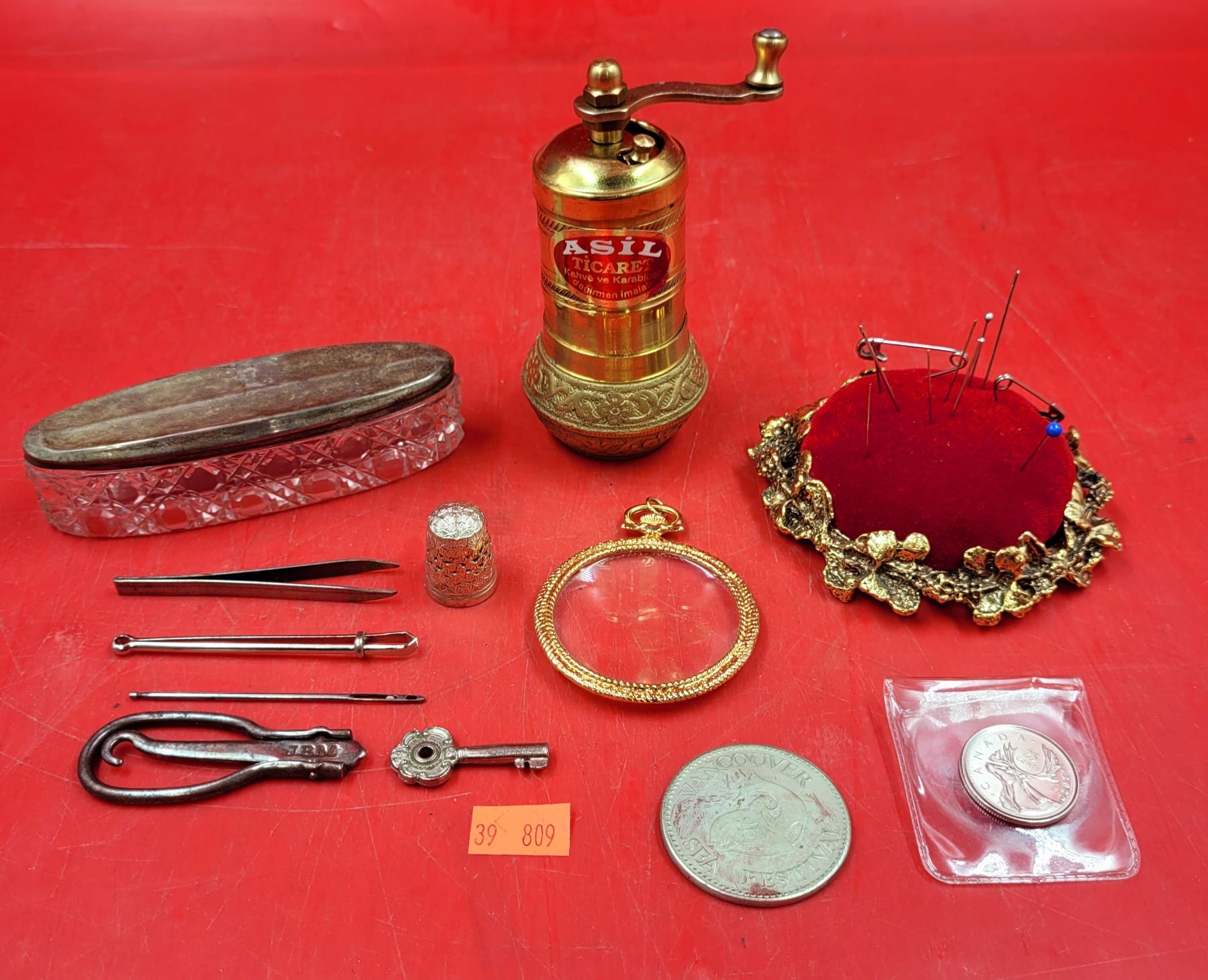 Brass Turkish Spice Mill Asil Ticaret Original Label, Pin Coushen, Key, Lidded Glass & Tweezers