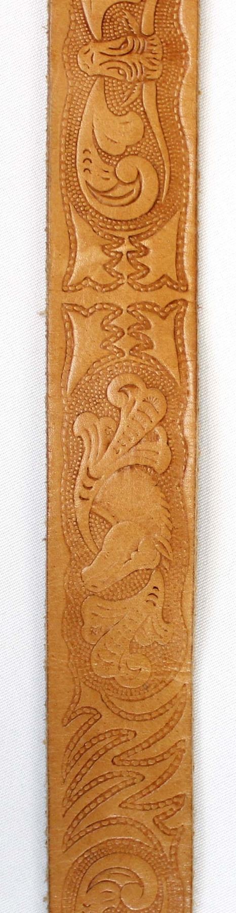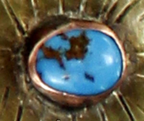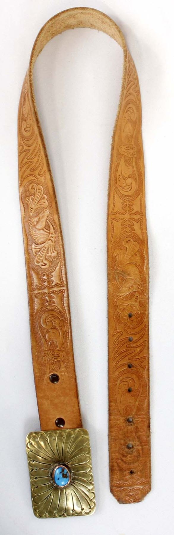 Brass & Sleeping Beauty Turquoise Hand Stamped Buckle on Hand Tooled Leather Belt, Copper Bezel, buckle measures 2'' x 3'', belt measures 33.5''L x 1.5''
