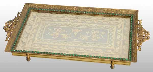 Description Marked "Empire Art Company". Includes 130 green colored jewels with linen underneath of glass tray piece. Condition (Excellent). Size 13" x 7".