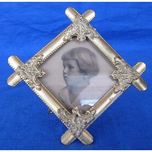 Victorian Brass diamond shaped Picture Frame which is in excellent condition and has the original back. The corners are embellished with a design in brass. The frame has a picture of a child which can be easily removed to put your own picture in. The frame is 3.5 by 3.5 inches.