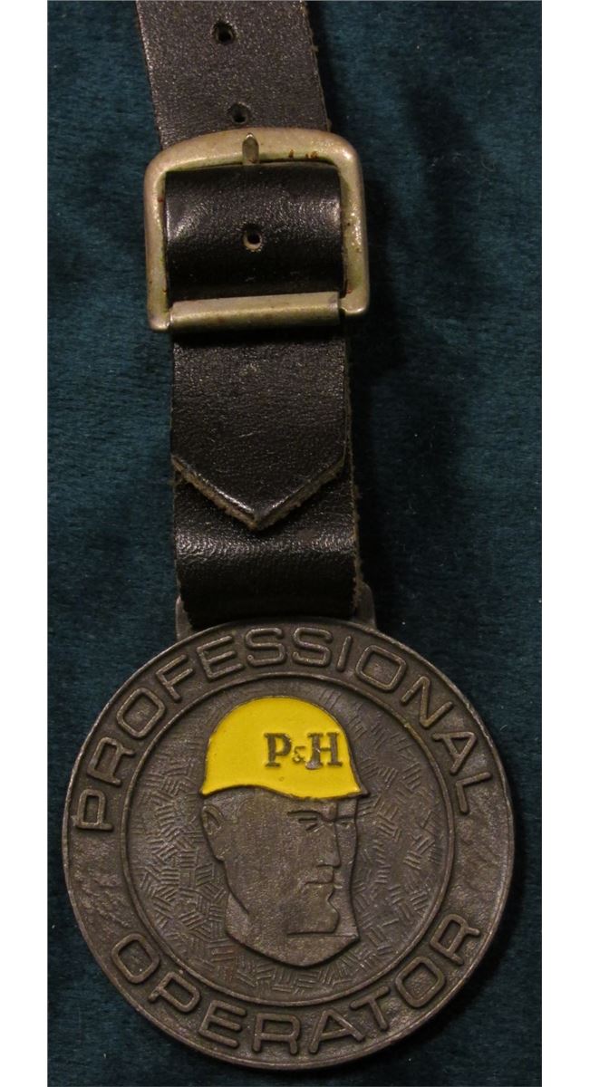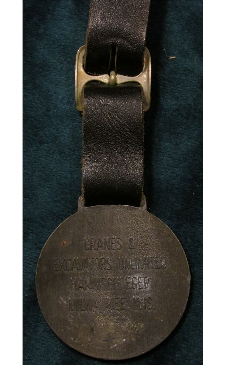 Brass Watch Fob with leather strap "Professional Operator", "Cranes &/Excavators Unlimited/Harnischefeger/Milwaukee, Wis."