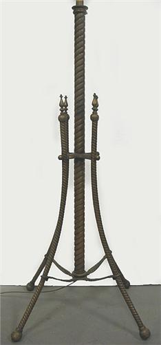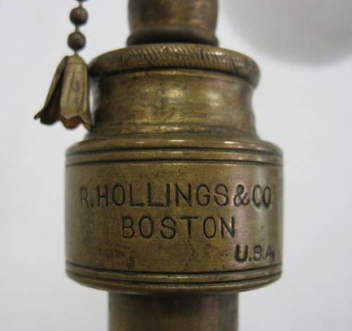Brass adjustable floor lamp; rope turned standard with four splay legs on ball feet; cloth fringe shade; marked R. Hollings & Co. Boston U.S.A. pat. Date 1886; approximately 6' (height is adjustable) (no visible defects)