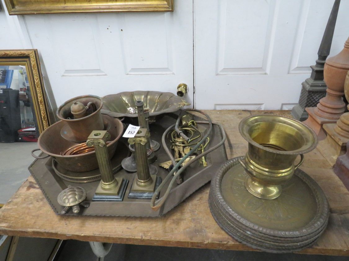 Brass and Copper Spitoon, Charger, Candlestands, Turtle, Décor