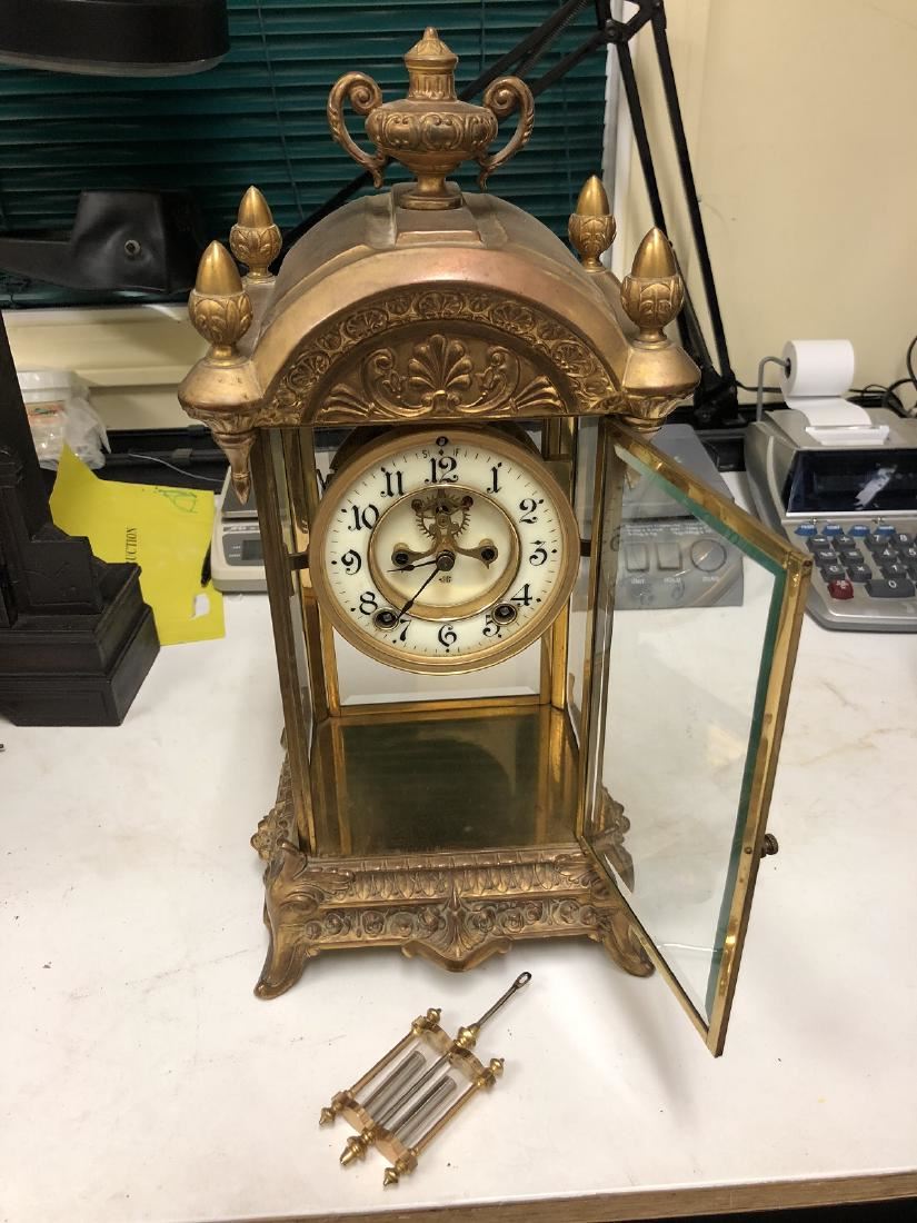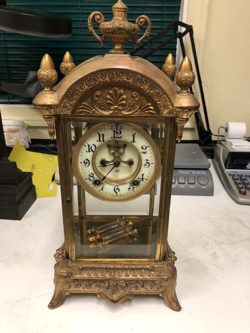 Brass and Glass Crystal Regulator. Very ornate, all original, running condition with original pendulum, very ornate, urn top, open escape movement, very ornate base.