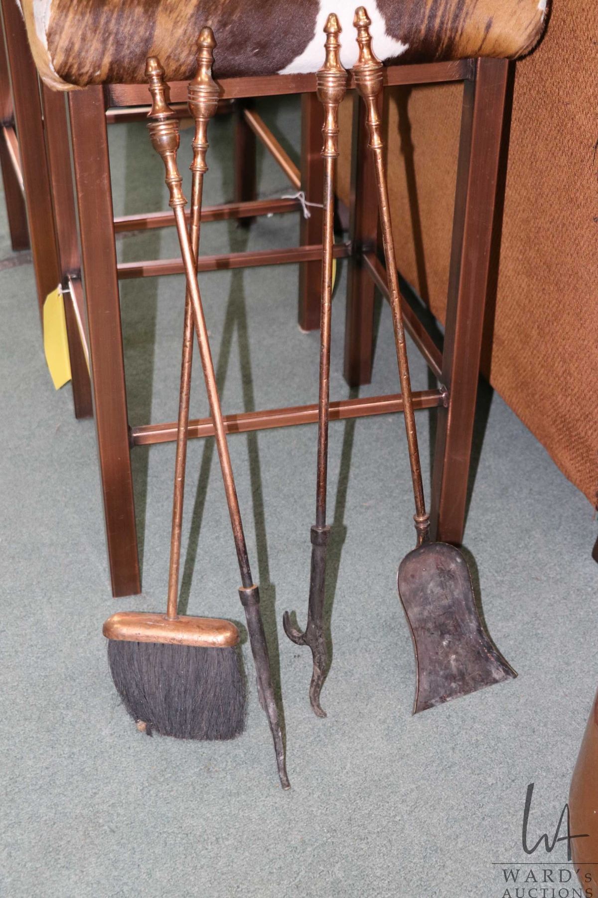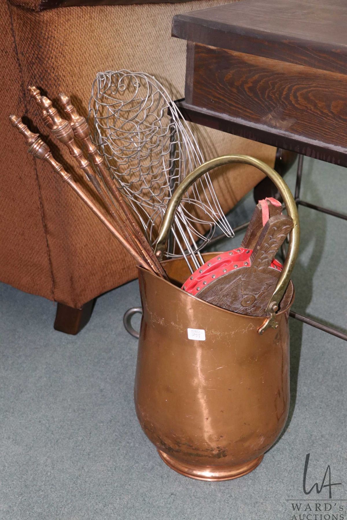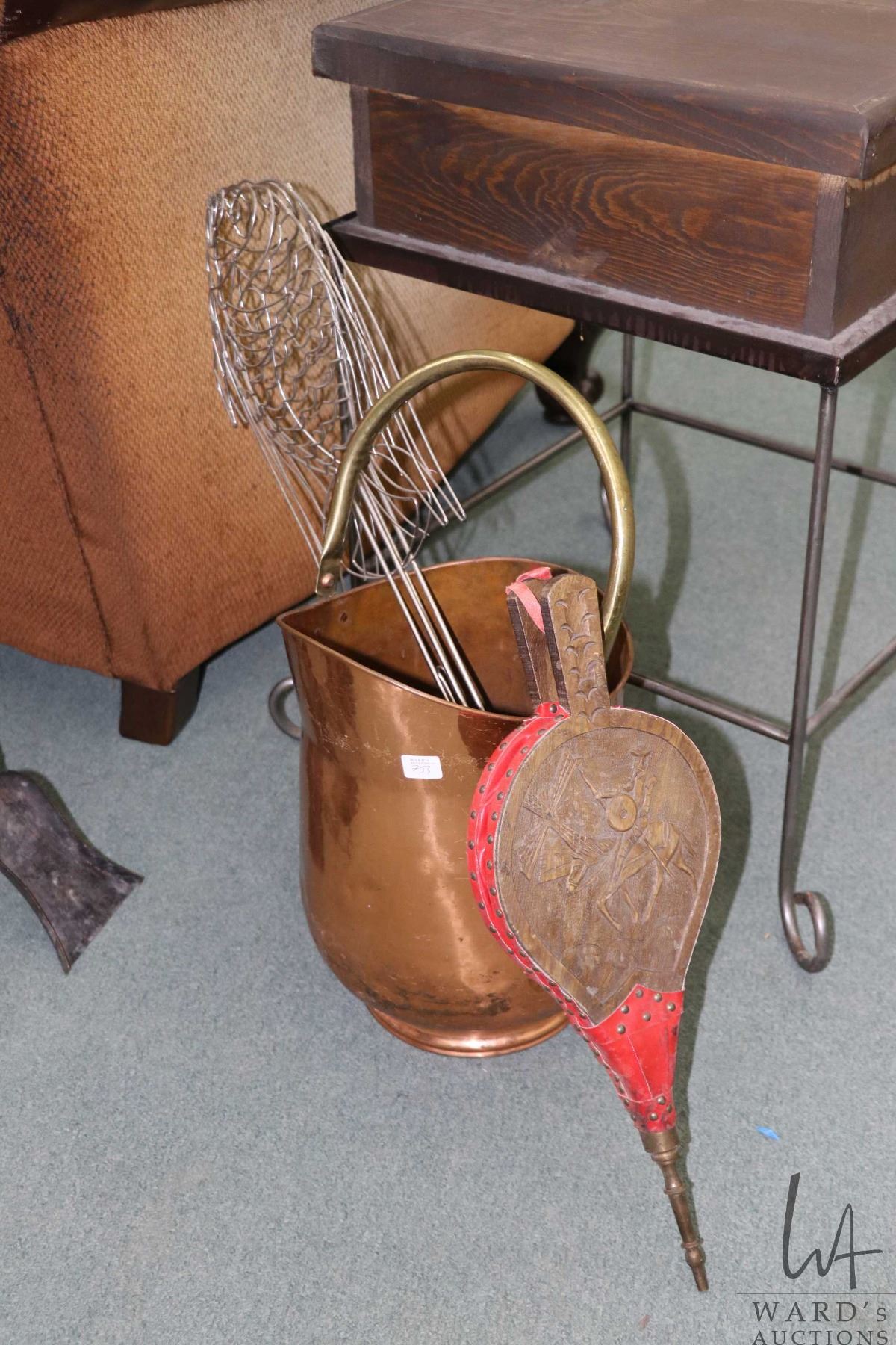 Brass and copper coal hod, set of bellows companion set, and fish motif fire cooker