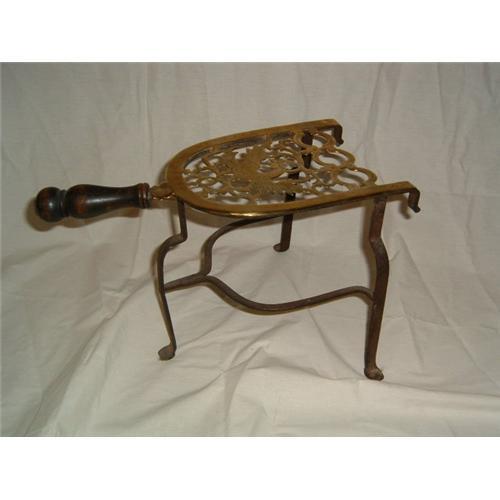 Brass and wrought iron trivet with a turned wooden handle. Decorated with a bird in brass. England, circa 1790-1800.