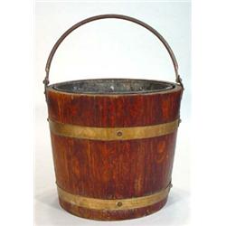 Brass banded oak bucket with swing handle and liner, 28cm high…