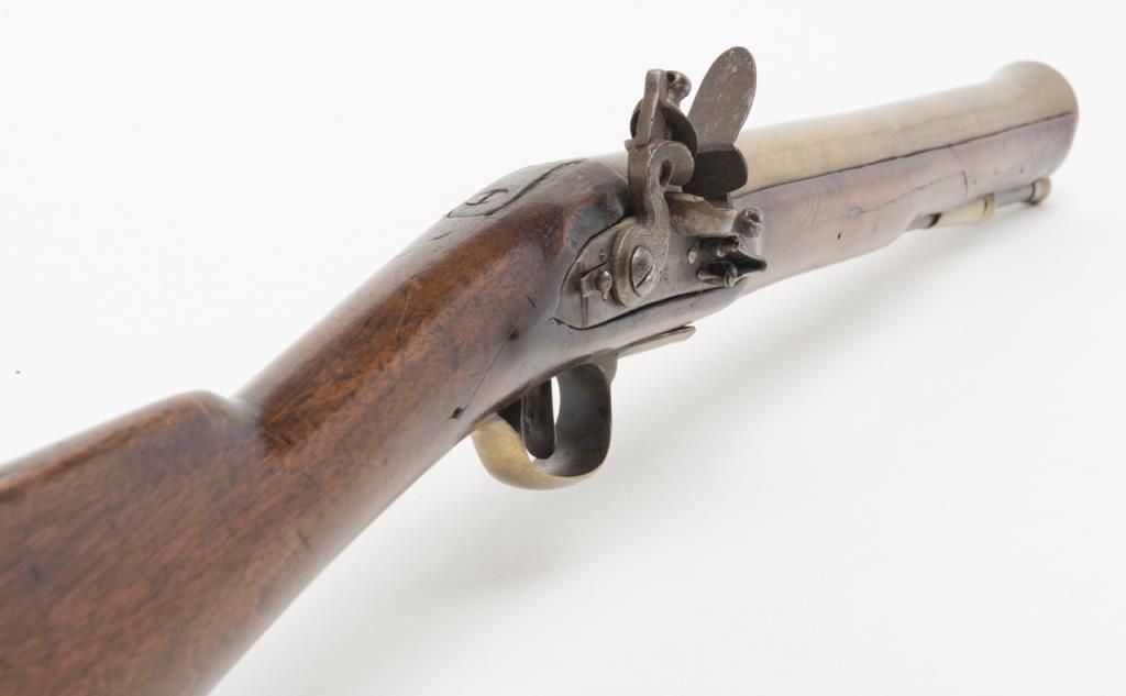 Brass barrel flintlock blunderbuss or coach gun marked “Lane” on the lock circa about 1810-30 with British proofs marks on the barrel. The gun measures 30 ¾” overall with 16” flared naval brass barrel which measures 1 ¼” across the bore and 15/8” across the flats to the outside edges. The barrel shows a good patina with some minor nicks, mars and normal aging. The lock shows a dark patina and some pitting. The name Lane is engraved in block letters and appears later then themanufacturer of this gun indicating possible agent or owner’s name. The lock is in its original flintlock configuration with replaced top jaw and screw. The stock has been lightly refinished and shows wood repairs to the fore end which areprofessionally done but somewhat extensive. A brass tip period ramrod is included. A classic blunderbuss of the type used to defend coaches from Highwaymen. Est.: $1200-$2400