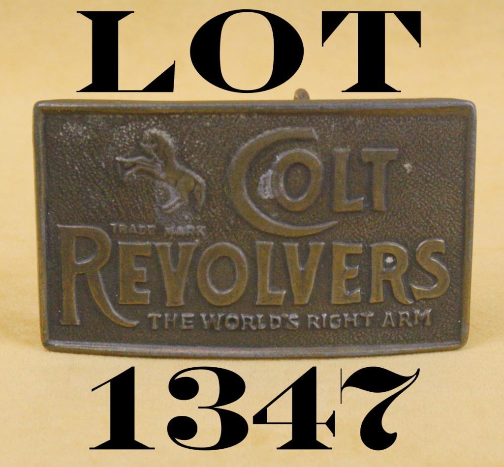 Brass belt buckle approx. 2-1/4” x 4” with raised “Colt Revolvers, The World’s Right Arm” and a Rampant Colt trade mark in overall good condition. These fantasy buckles were made in the 1970’s and have developed acollector following of their own. Est.: $25-$35.