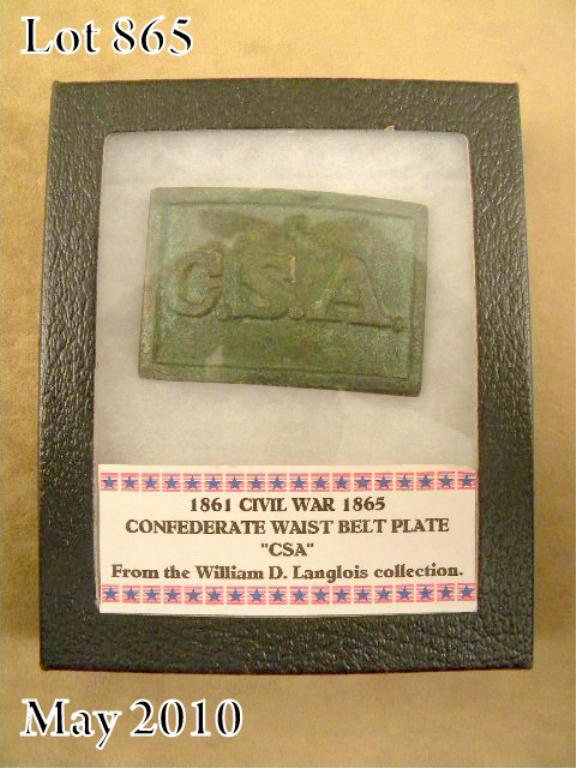 Brass belt plate marked “C.S.A.”, approx. 2” x 2-3/4” showing a heavy patina overall and with three integral belt mounting prongs on the back of the plate; from the famous William D. Langlois collection of Civil War artifacts, many of hispieces were pictured in the Civil War Encyclopedia. Langlois was also an undercover police officer who wrote books on Law Enforcement techniques. Not Authenticated. Est.: $300-$600.