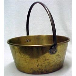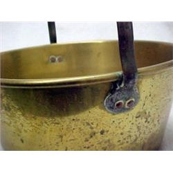Brass bucket, iron bail handle with copper rivets, 13" high to top of handle, 12 1/2" diameter, early 20th C. Estimate 70/120