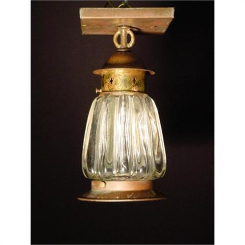 Circa 1920 Brass ceiling light fixture with ribbed glass shade in original dark patina.