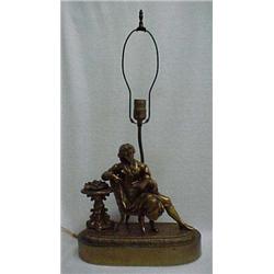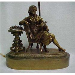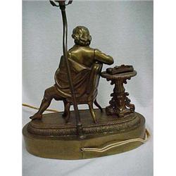 Brass figural lamp, seated gentleman in chair with table, on oval metal base, 12-1/2" to top of gentleman, 26-1/2" to top of finial