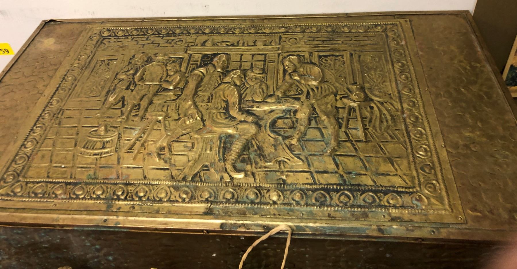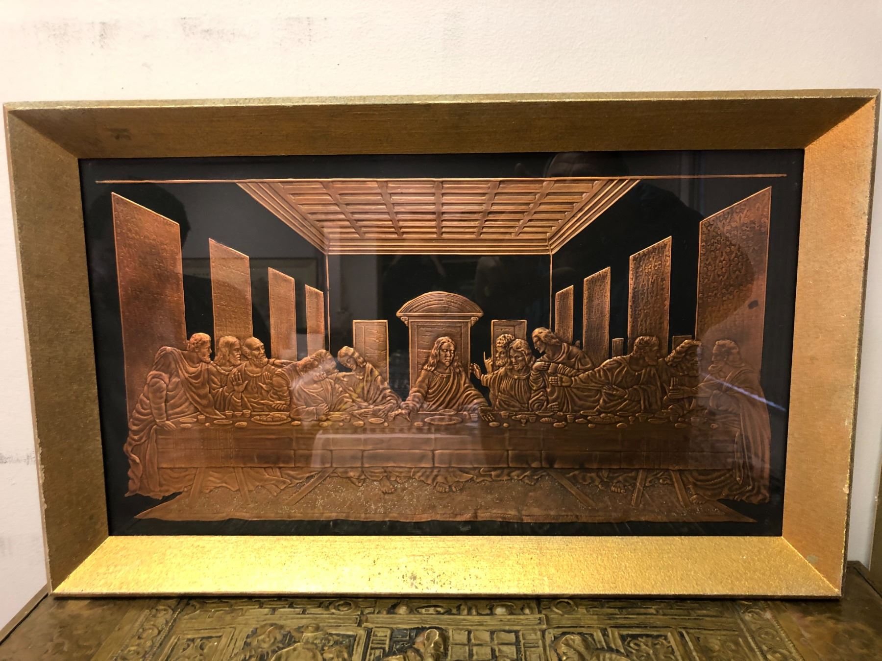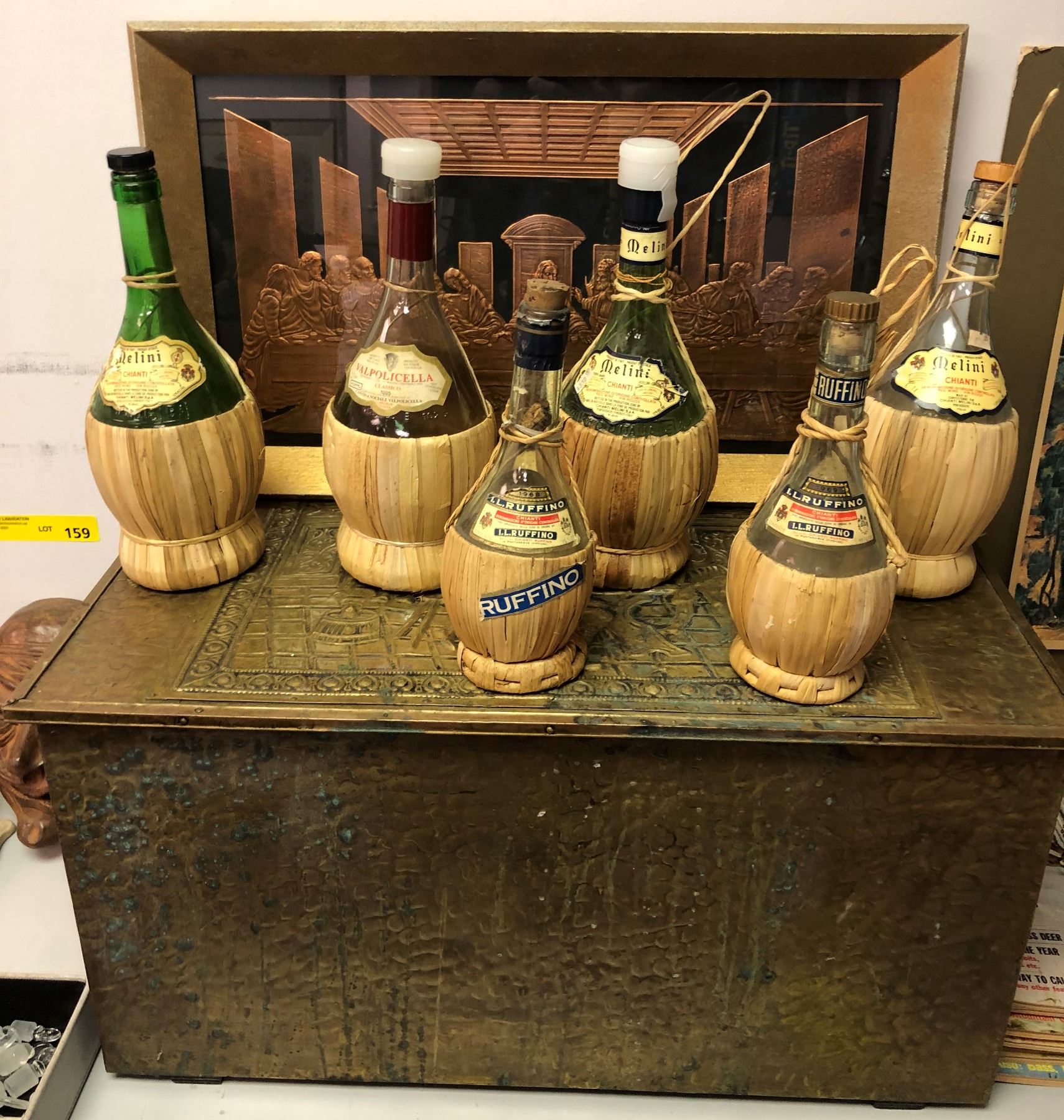 Brass fire place box/ Ruffino bottles & framed brass embossed The Last Supper image