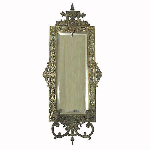 Brass framed double candle sconce with beveled mirror; urn and dolphin crest; pierced frame; two C-shaped arms extending out from bottom of frame; terminating in candle holders; late 19th to early 20th C.; 26" high x 10 1/2" across