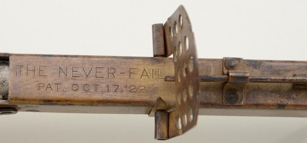 Brass gopher trap marked “The Never Fail”; approx. 8” overall and in very good condition with a pleasing dark patina to the brass; working mechanism at time of description. Est.: $50-$100.