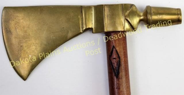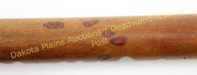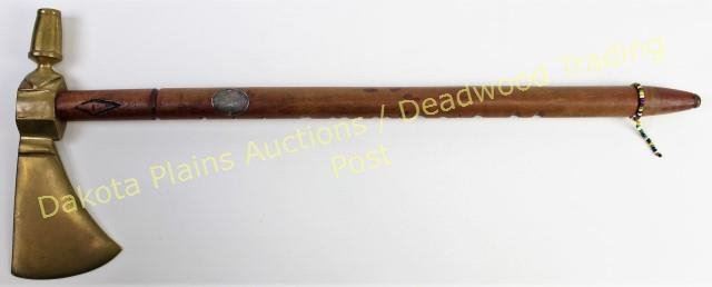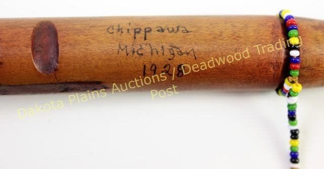 with carved stem 17" long with small beaded drop and applied German nickel oval medallion. Bottom of stem reads Chippewa Michigan 1928. From an old Michigan collection. Est. 250-500