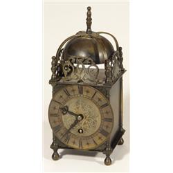 Brass lantern clock with dolphin decoration and empire movement, 24cm high