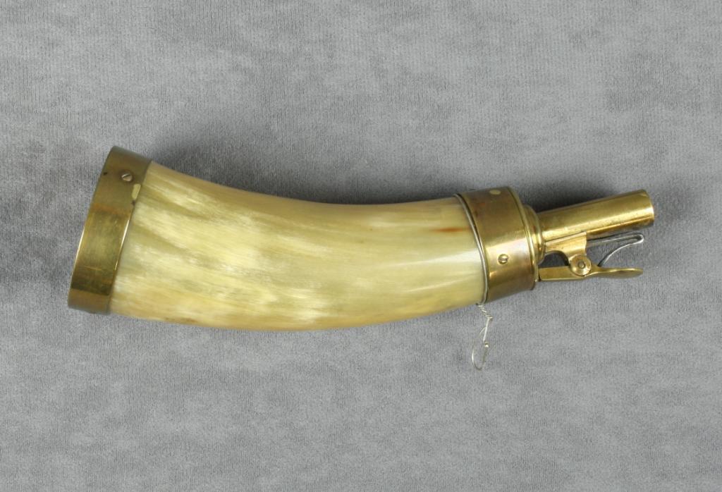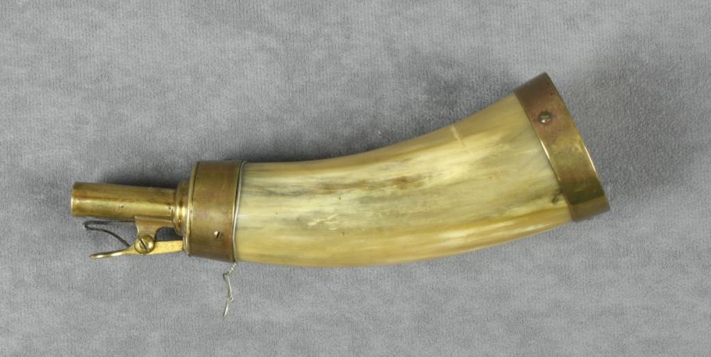 Brass mounted powder horn in overall very good to fine condition, approx. 7” overall. Est.: $125-$250.