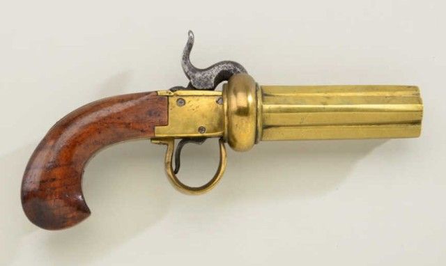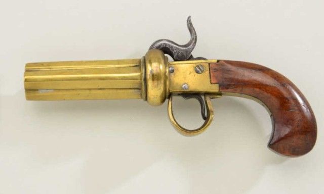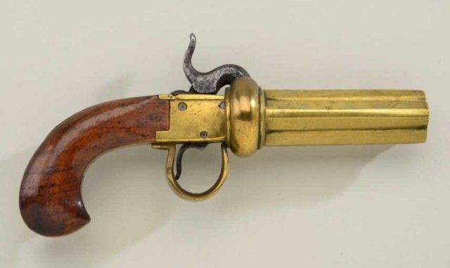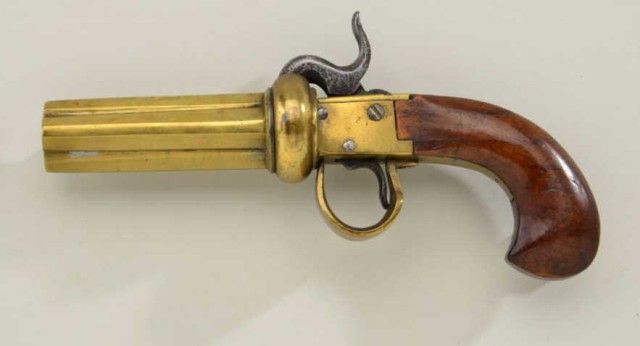 Brass pepperbox pistol of Swedish mfg. attributed to J.Engstrom and originally incorrectly identified as “Darling” by early collectors. Refer Flayderman 7B-007.5 The pistol measures 8-1/2” overall with 3-1/4”barrel group of approx 32 caliber, 4shots and hand revolved. The condition is very good plus to near fine with exceptional wood showing just a couple of minor scratches. The hammer shows some minor pitting, thebrass is crisp and uncleaned. The hammer does not stay cocked. From an old New York collector’s estate. Est.; $600-$1,200.