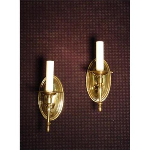 Circa 1930 A pair of brass single light sconces with oval back plate.The sconces are rewired and ready to install.Antique gallery.