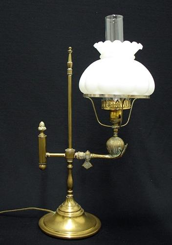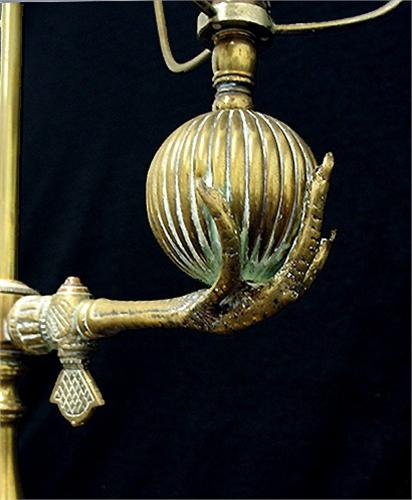 Brass student lamp; with pineapple finial on font; and talon claw holding light; milk glass shade; early 20th C.; 20 1/4" high to top of standard (no visible defects)