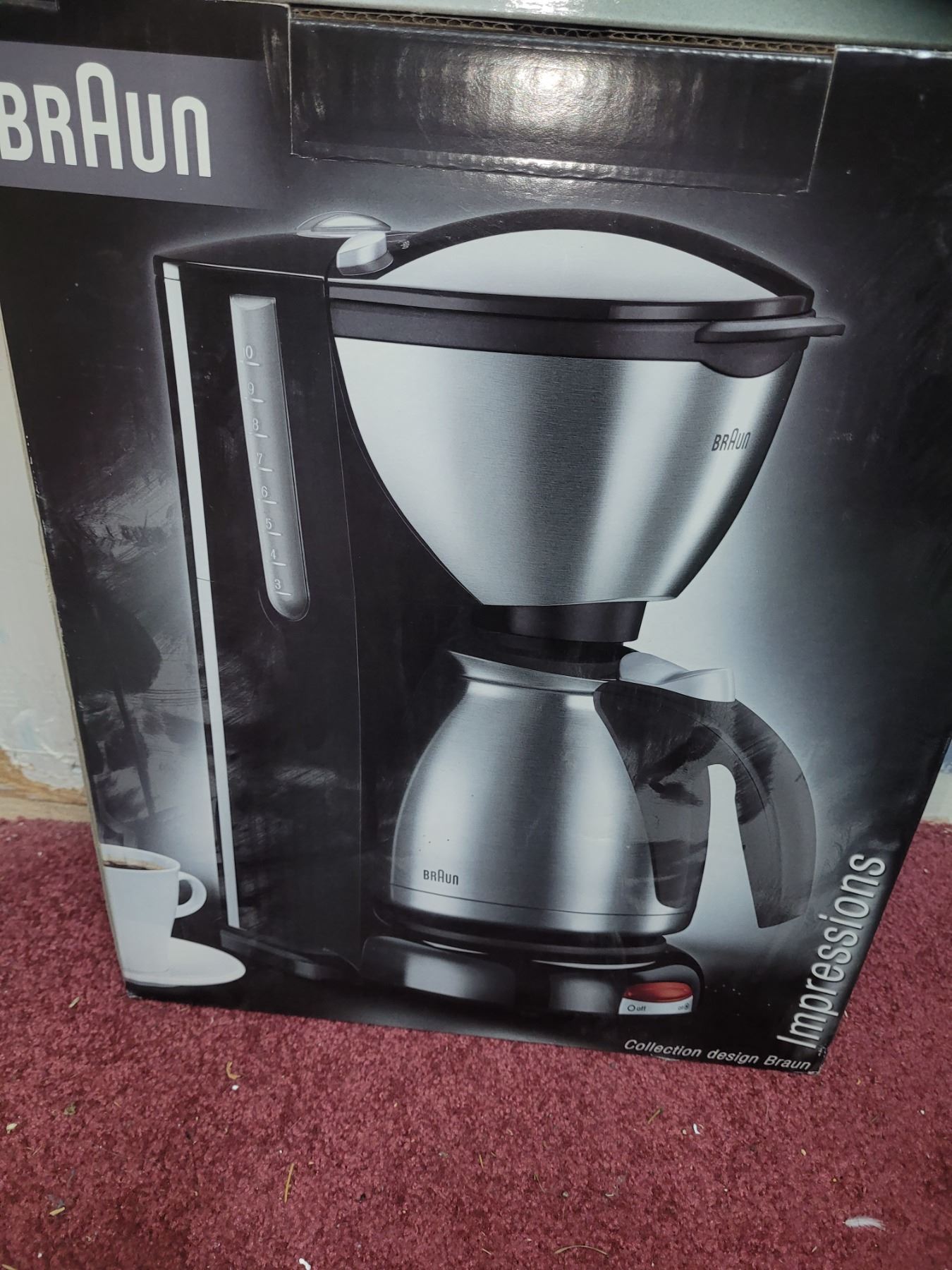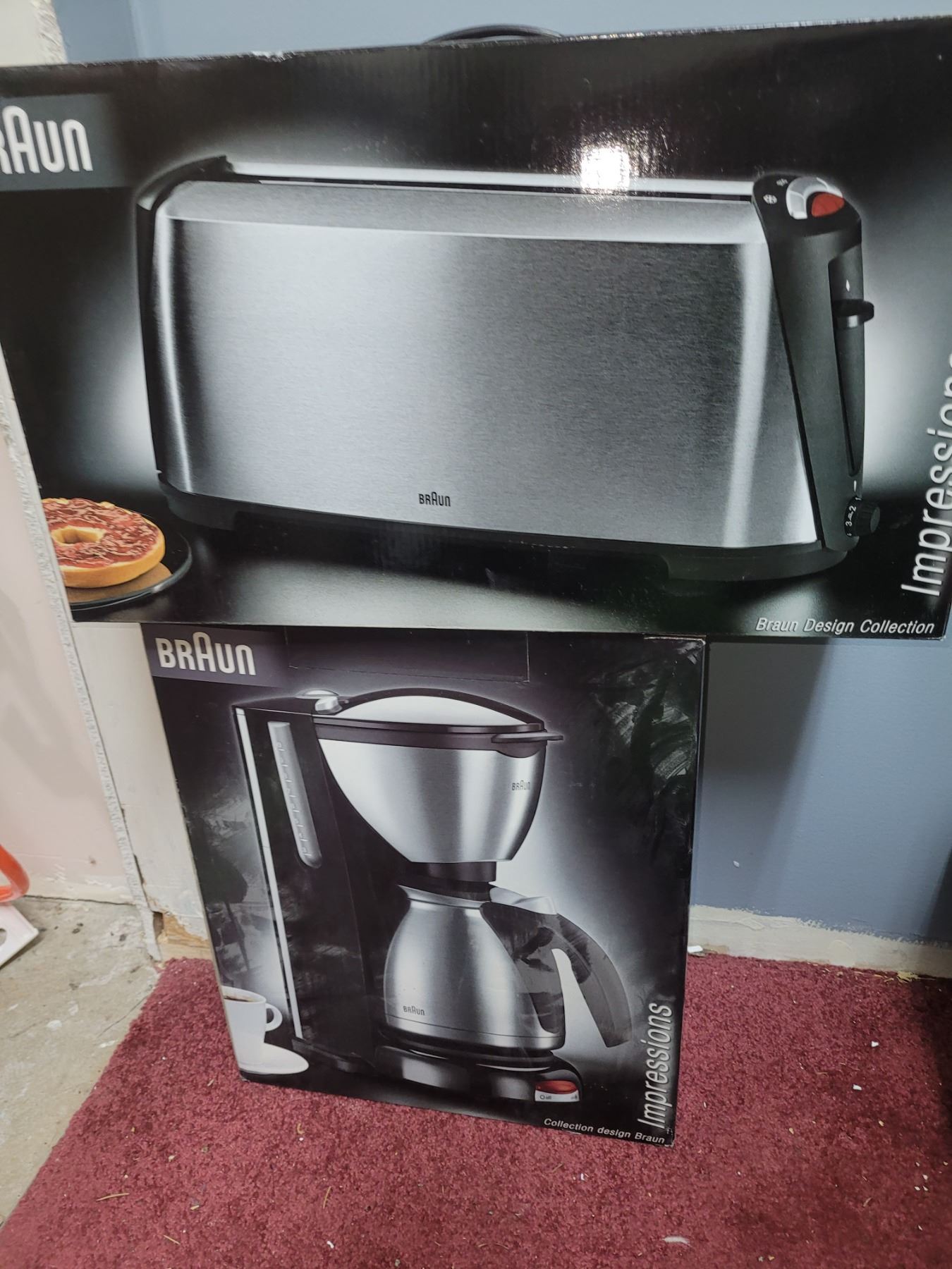 Braun coffee maker and toaster in box. 11am.