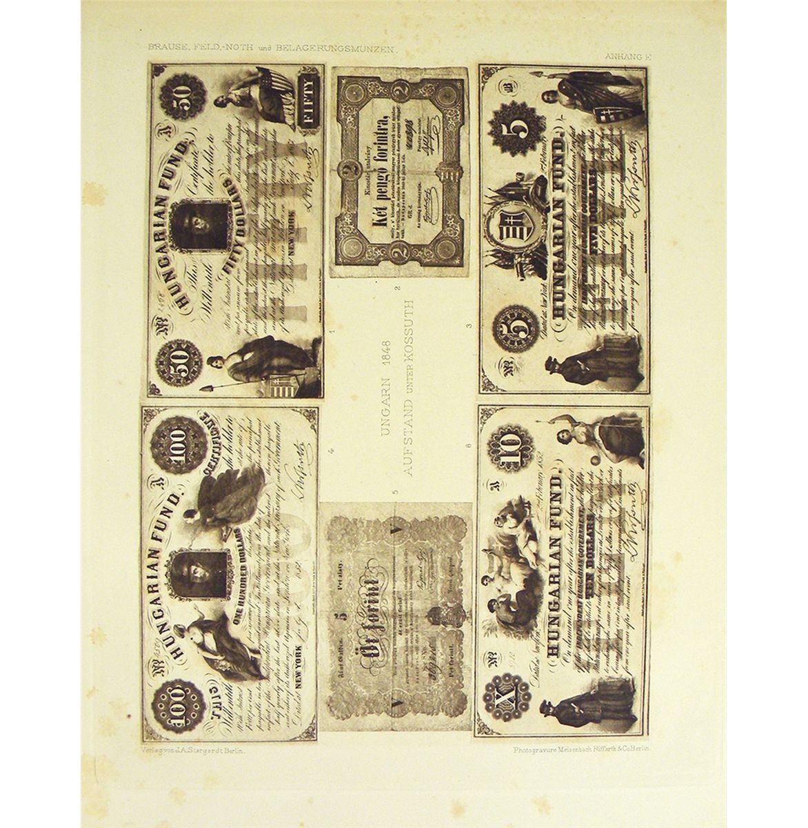 Brause-Mansfeld, August. FELD-, NOTH- UND BELAGERUNGS-MÜNZEN VON DEUTSCHLAND, ÖSTERREICH-UNGARN, SIEBENBÜRGEN, MOLDAU, DÄNEMARK, SCHWEDEN, NORWEGEN, RUSSLAND, POLEN U.S.W. [with] FELD-, NOTH- UND BELAGERUNGSMÜNZEN VON ENGLAND, FRANKREICH, HOLLAND, ITALIEN, SPANIEN. Berlin: Verlag von J. A. Stargardt, 1897 & 1903. Two volumes. Folio, slightly later matching green cloth, gilt. xi, (1), 118; viii, 80, (2) pages; printed and attractively engraved titles in red and black; 48 + 7 + 38 handsome photolithographic and photogravure plates of coins and currency bound in on hinges. Bindings a bit worn, with small tear to cloth at head; contents fine. Ex Wayne Raymond, with his bookplate. A clean, fresh set of this great classic work on siege money, handsomely designed and printed. Rare and still indispensable. Clain-Stefanelli 16289*. Grierson 44. Mária & Lajos 227.