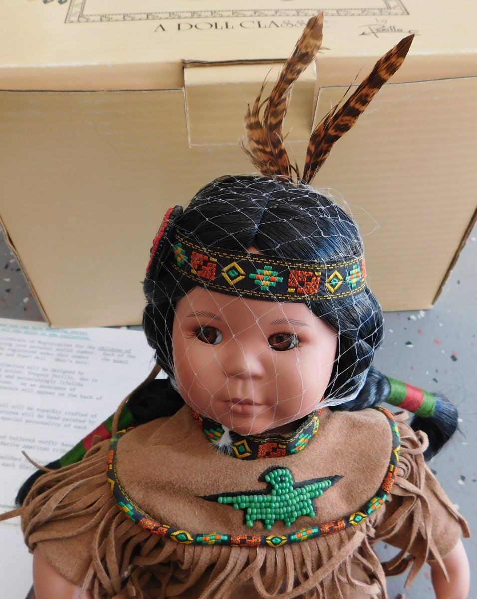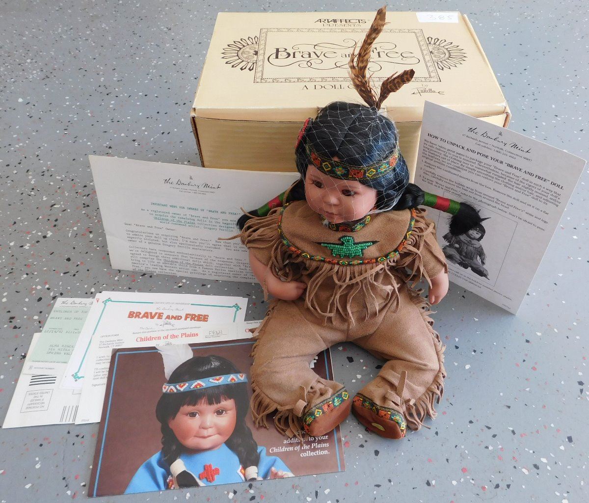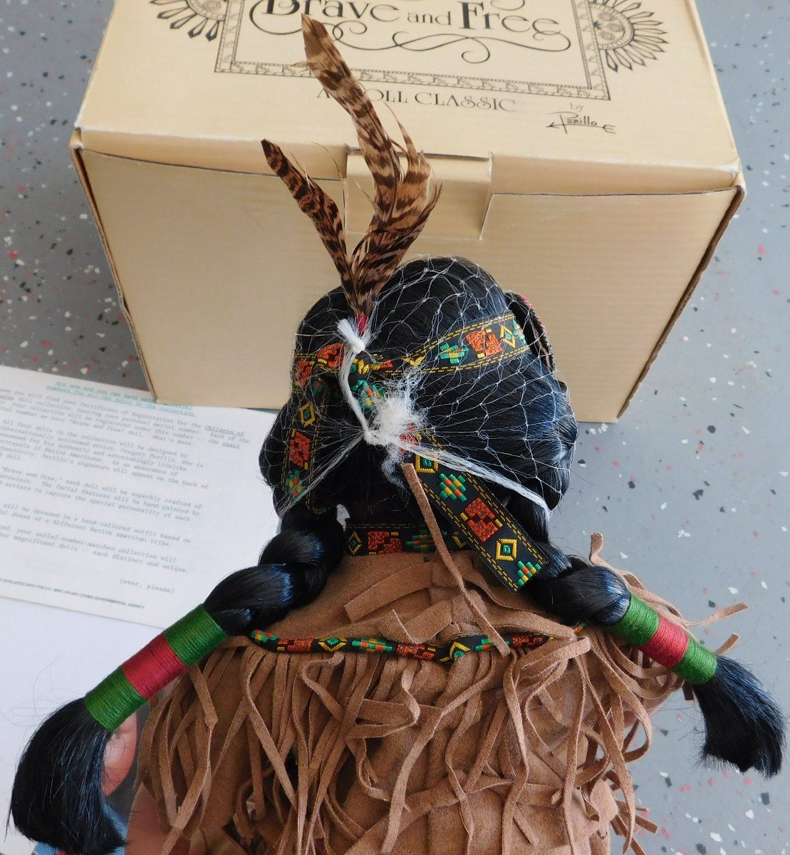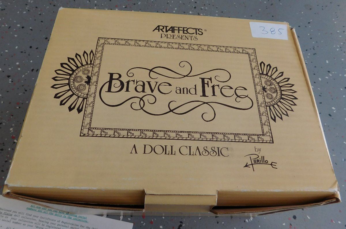 "Brave & Free" Doll by Perillo, 1992. Made of leather, beads, hair, feathers and possibly porcelain or ceramic, the item measures 8.5" x 8" x 12" tall. Sioux-style doll made by Perillo, crafted in China. From the Children of the Plains collection w/original paperwork and box. Condition: Like new, w/original box, see images. Shipping: $30.00 w/insurance and signature.